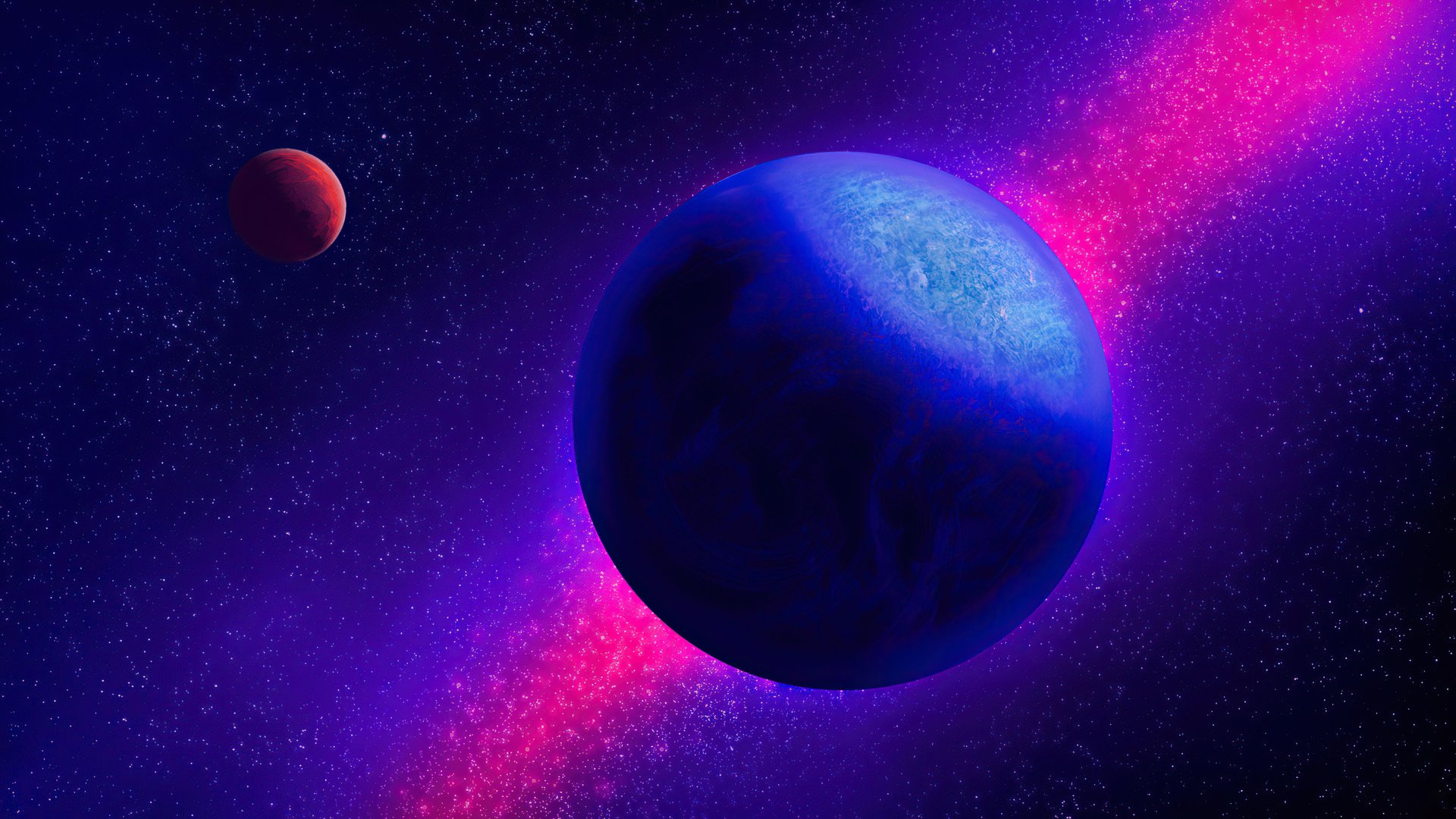 Description: A blue planet with a red disk in the background of a purple and blue sky with stars and a red light.