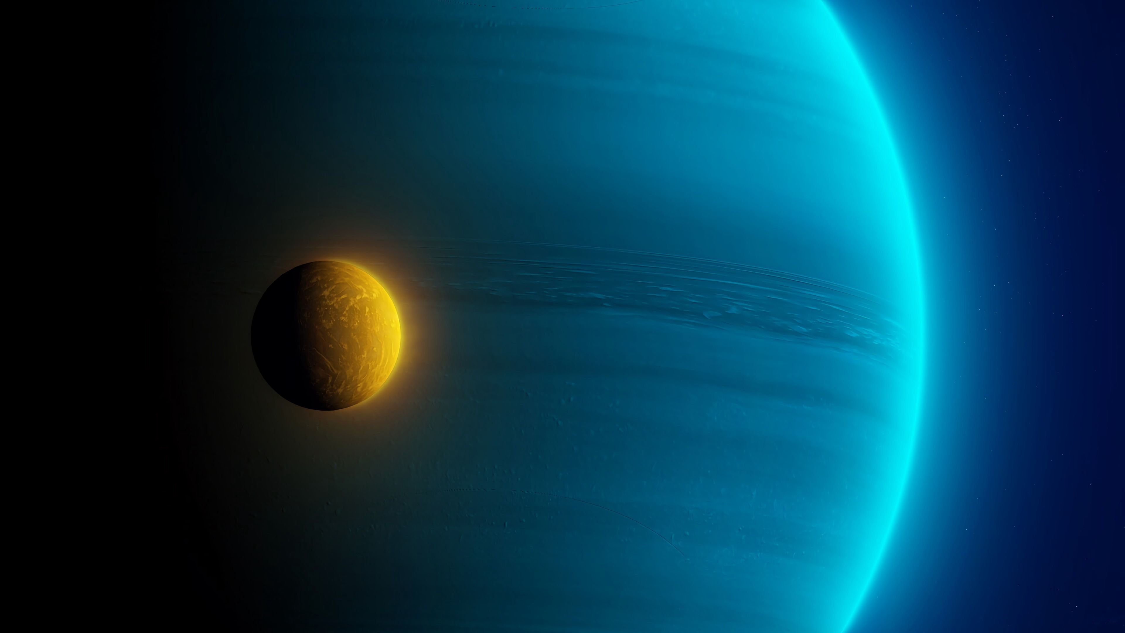 Description: A blue planet with a yellow moon in the background and a dark blue sky with a few clouds and a bright yellow spot.