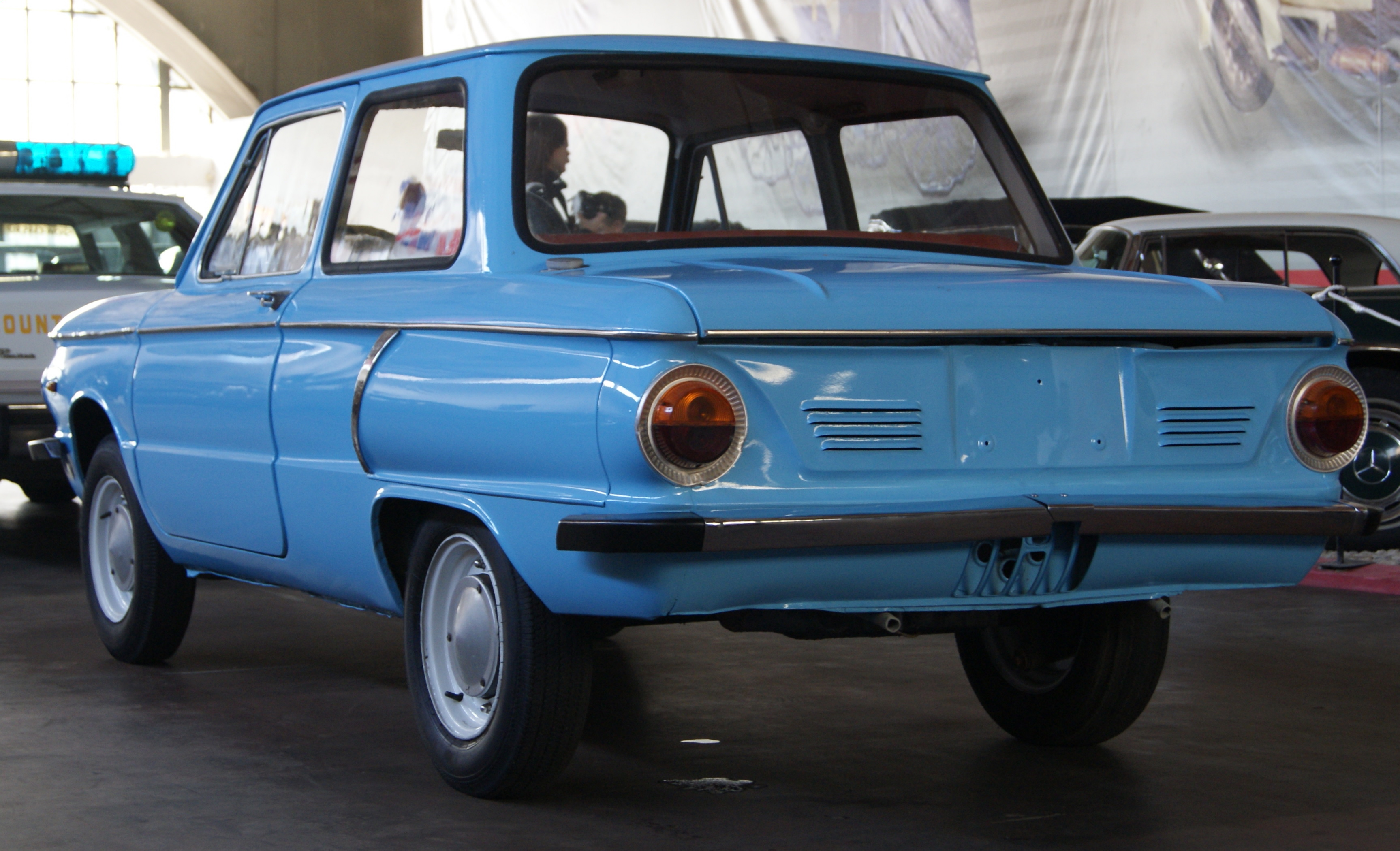 Description: A blue car is parked in a garage with other cars in the background and a police car in the foreground.