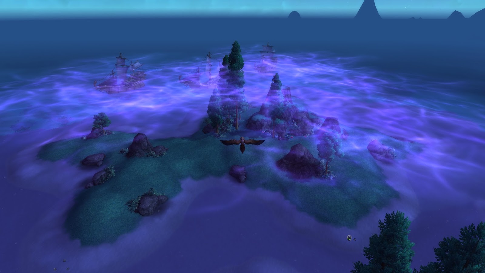 Description: A computer generated image of a blue and purple landscape with trees and rocks in the water and a blue sky.