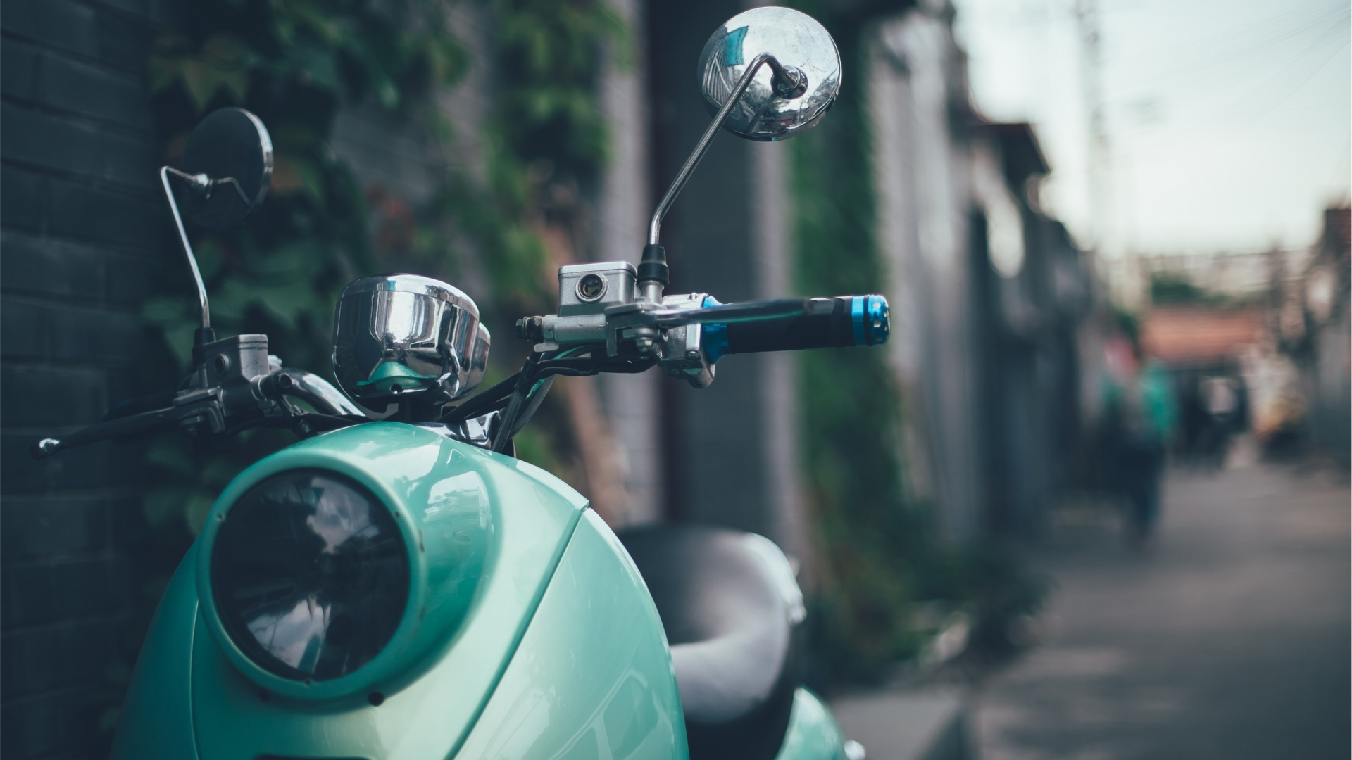 Description: A blue scooter parked on the side of a building next to a sidewalk with a person walking by.