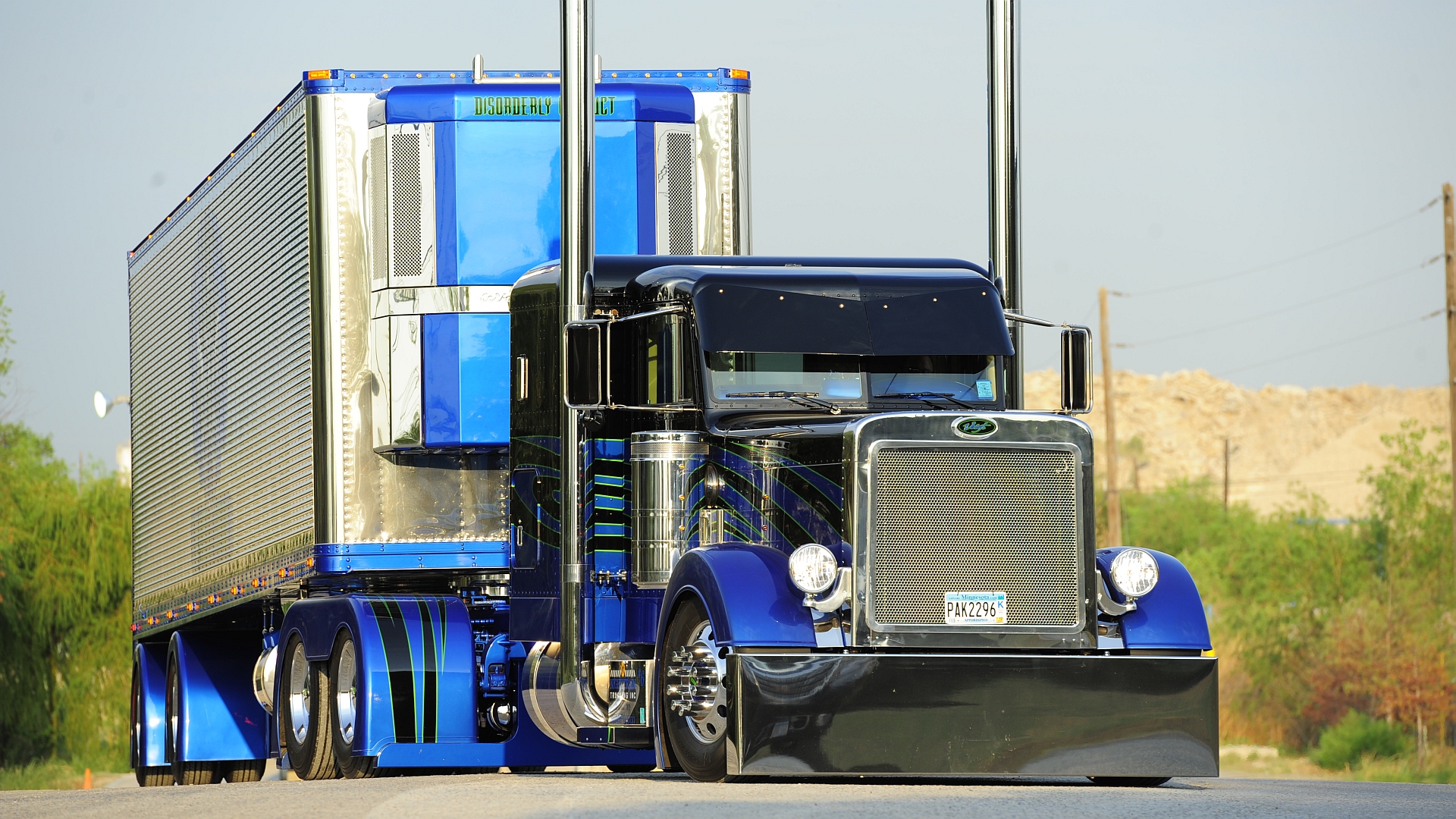 Description: A blue semi truck with a large trailer on the back of it's trailer is driving down a road.