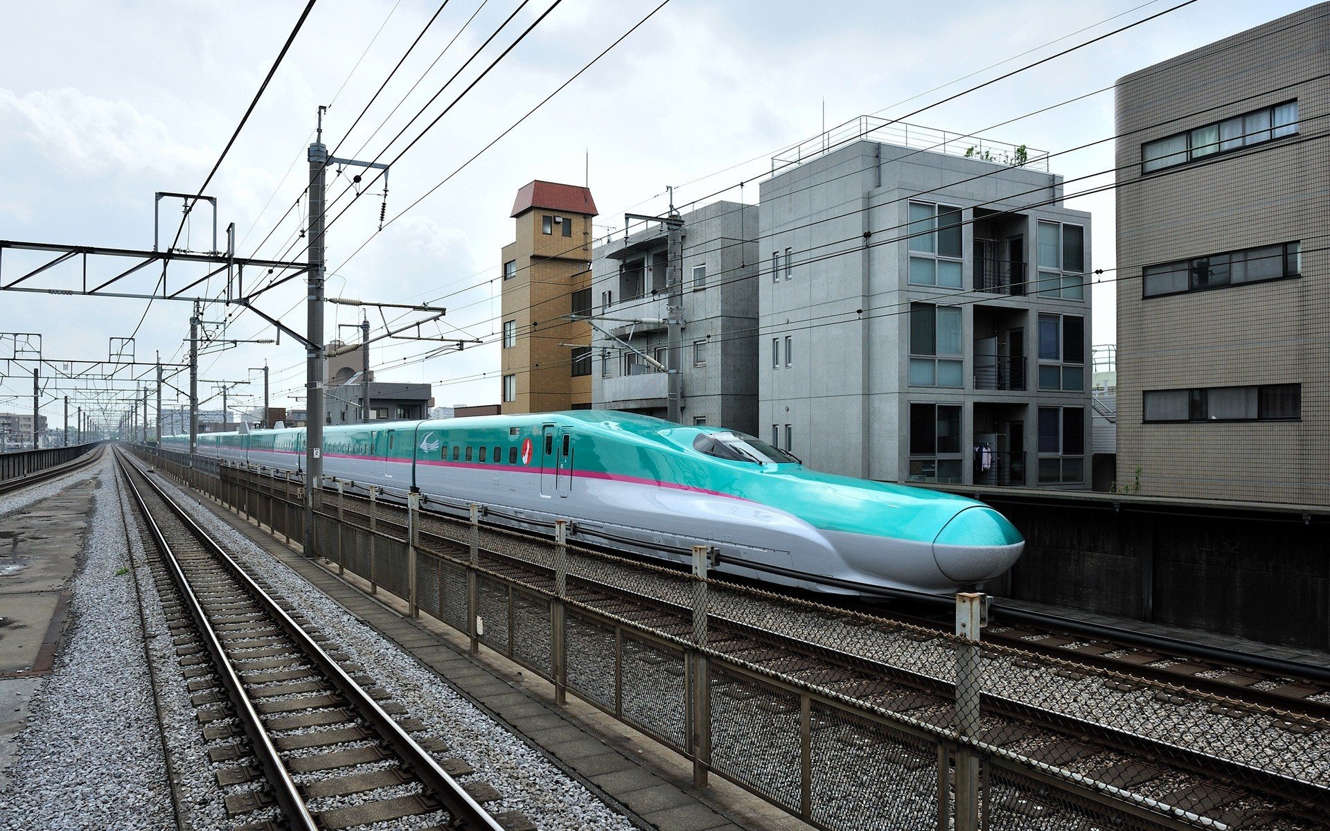 Description: A blue and silver train traveling down train tracks next to tall buildings and power lines in a city area.