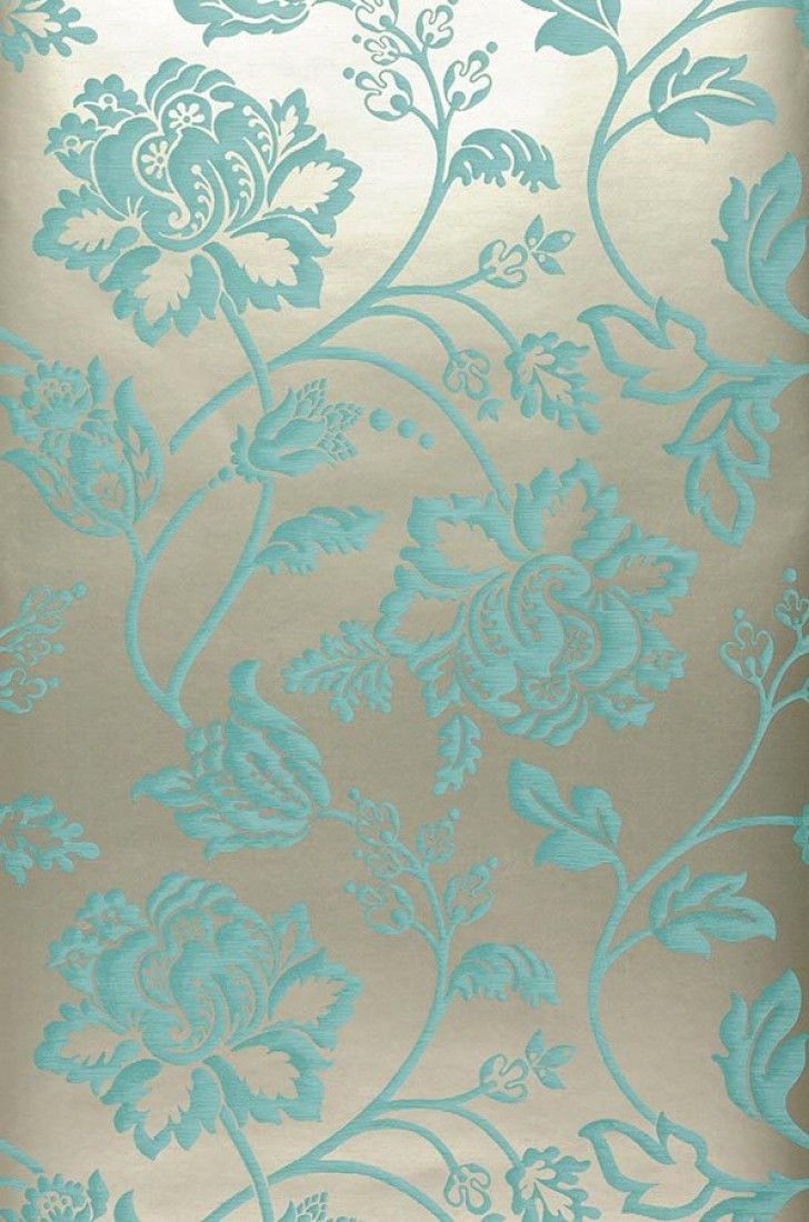 Description: A blue and silver wallpaper with a flower pattern on it's side of it's wall.