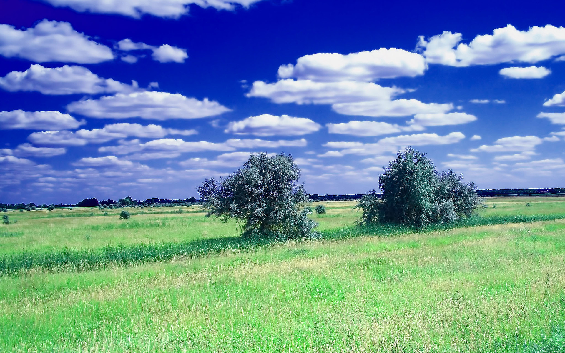 Description: A field with trees and grass under a blue sky with clouds in the background and a few clouds in the sky.