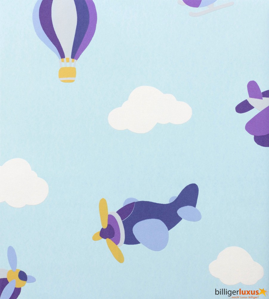 Description: A blue background with a pattern of hot air balloons and a plane in the sky with clouds and a plane.