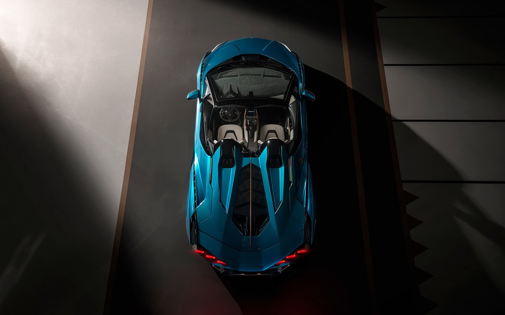 Description: A blue sports car is shown from above in a dark room with a red light on the floor and a black background.