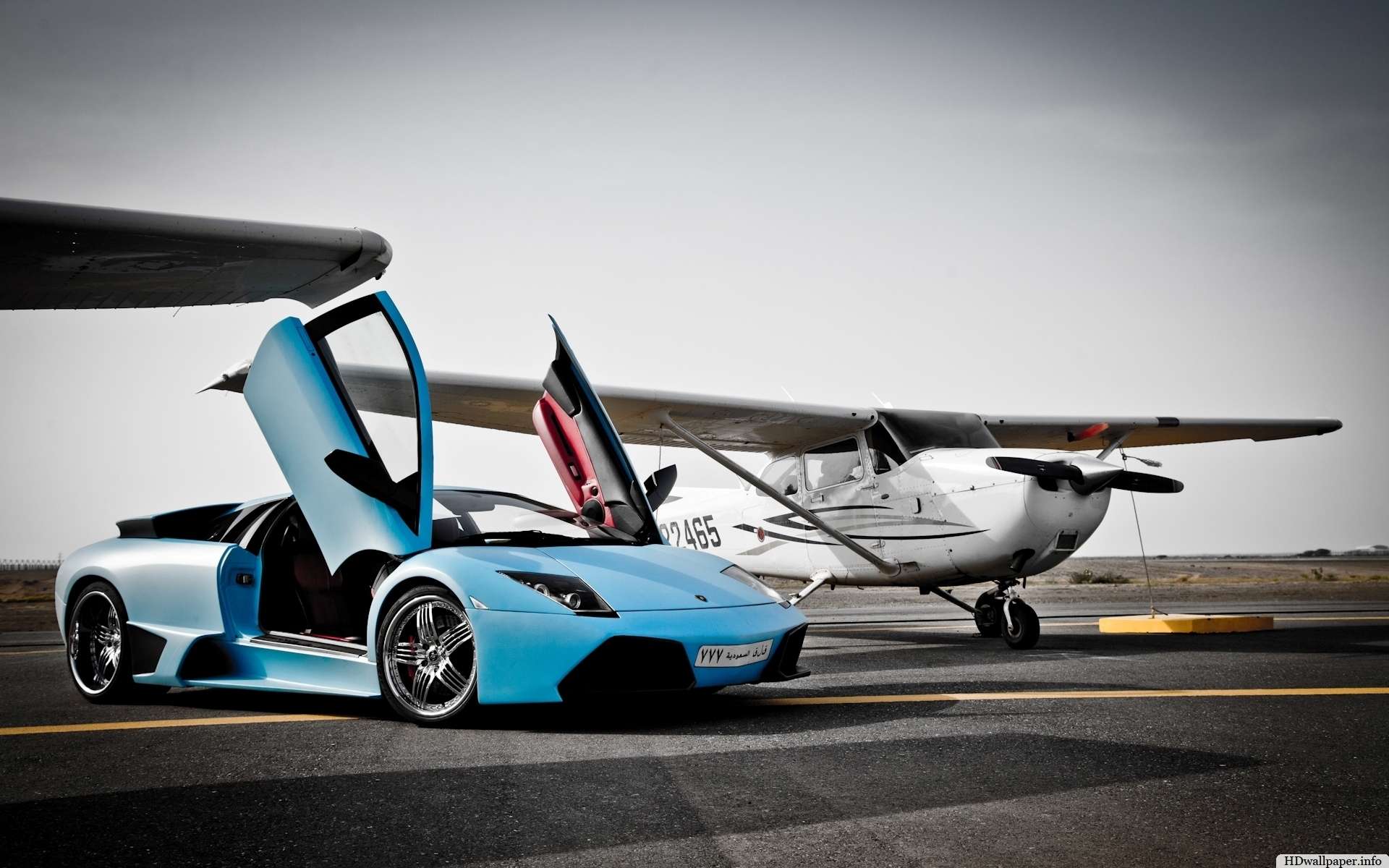Description: A blue sports car parked next to a small airplane on a runway with a plane in the background and a plane on the ground.