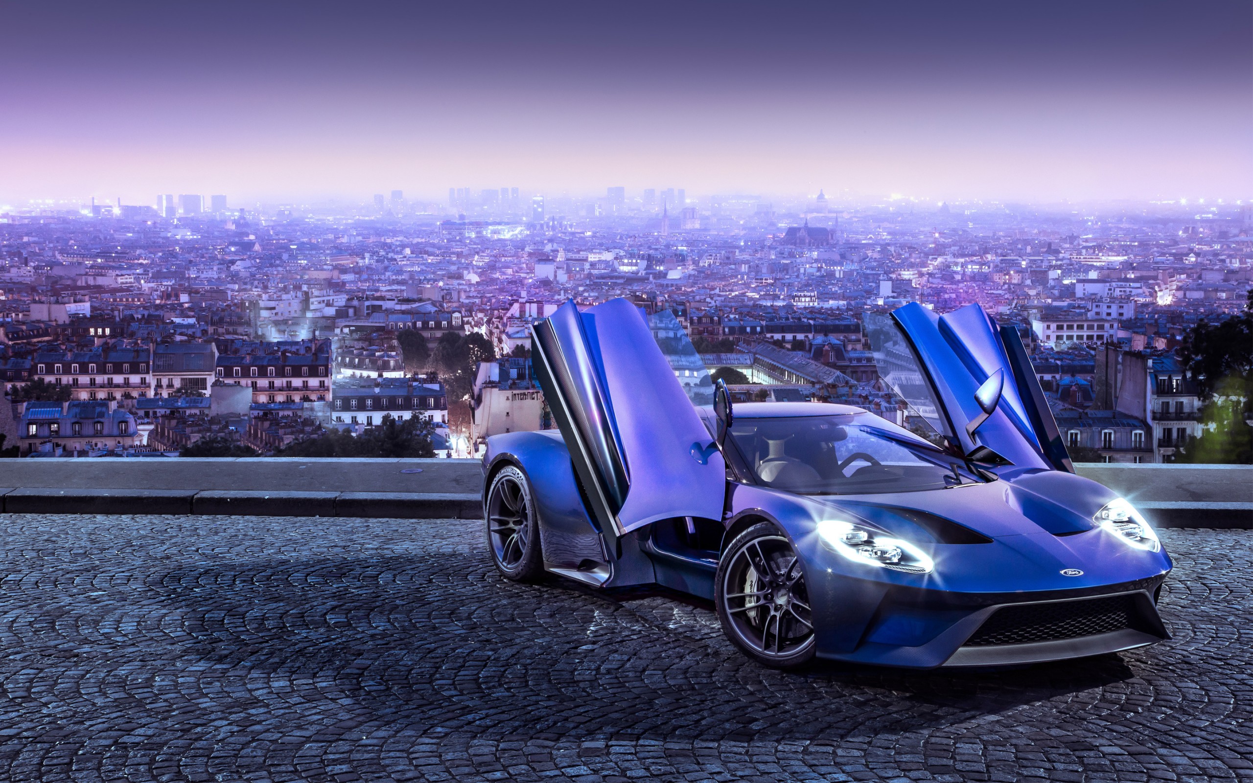Description: A blue sports car with open doors on a city street at night with the city lights in the background.