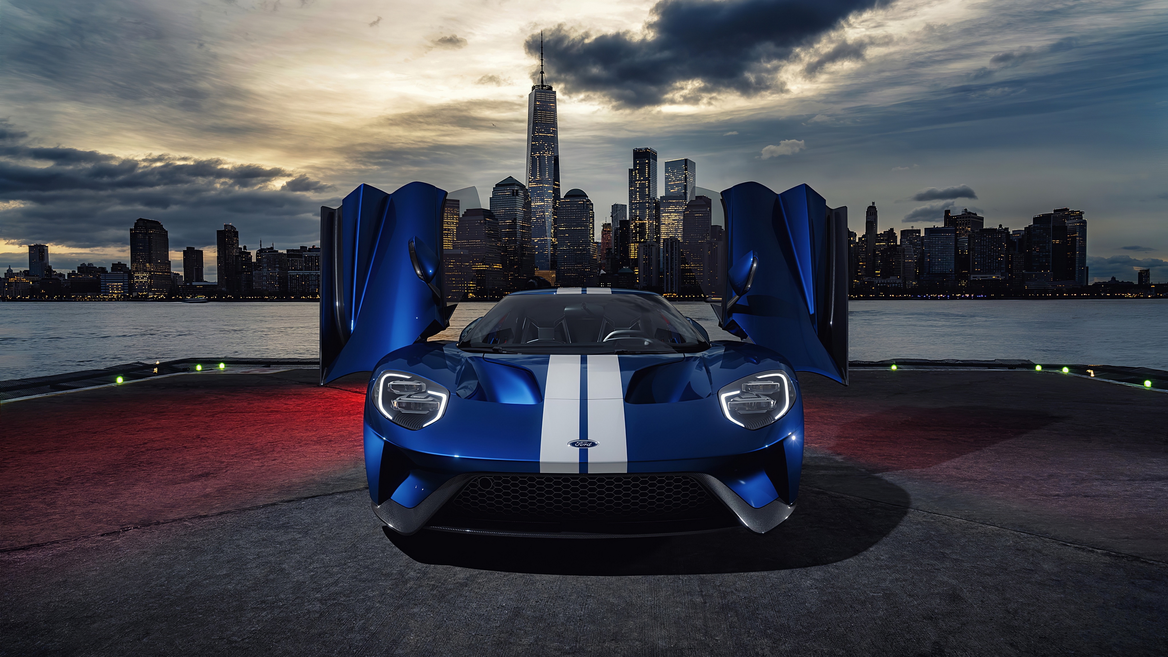 Description: A blue sports car parked in front of a city skyline with a red light at the end of the road.