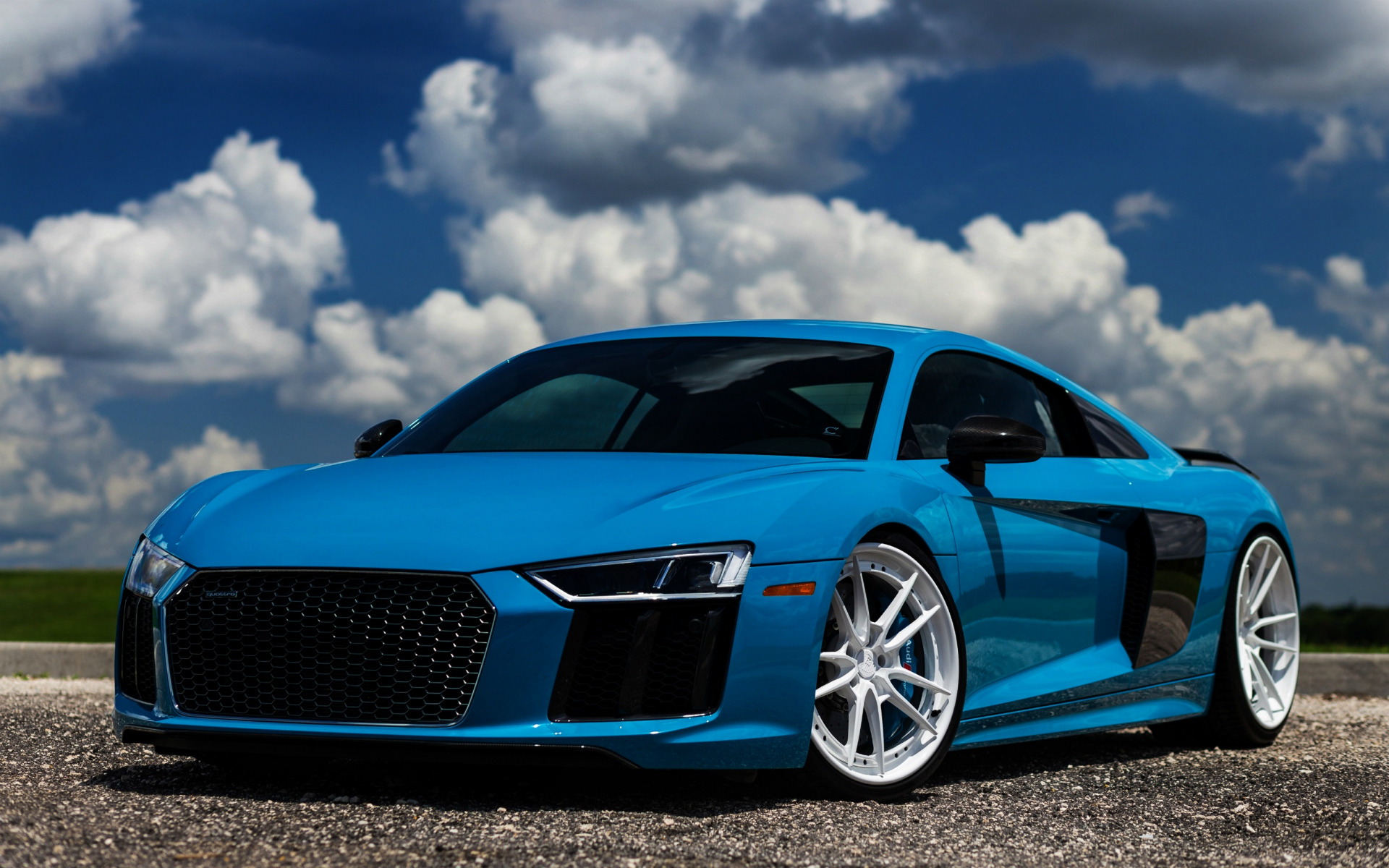 Description: A blue sports car parked on a gravel road under a cloudy sky with clouds in the background and a blue sky with white clouds.