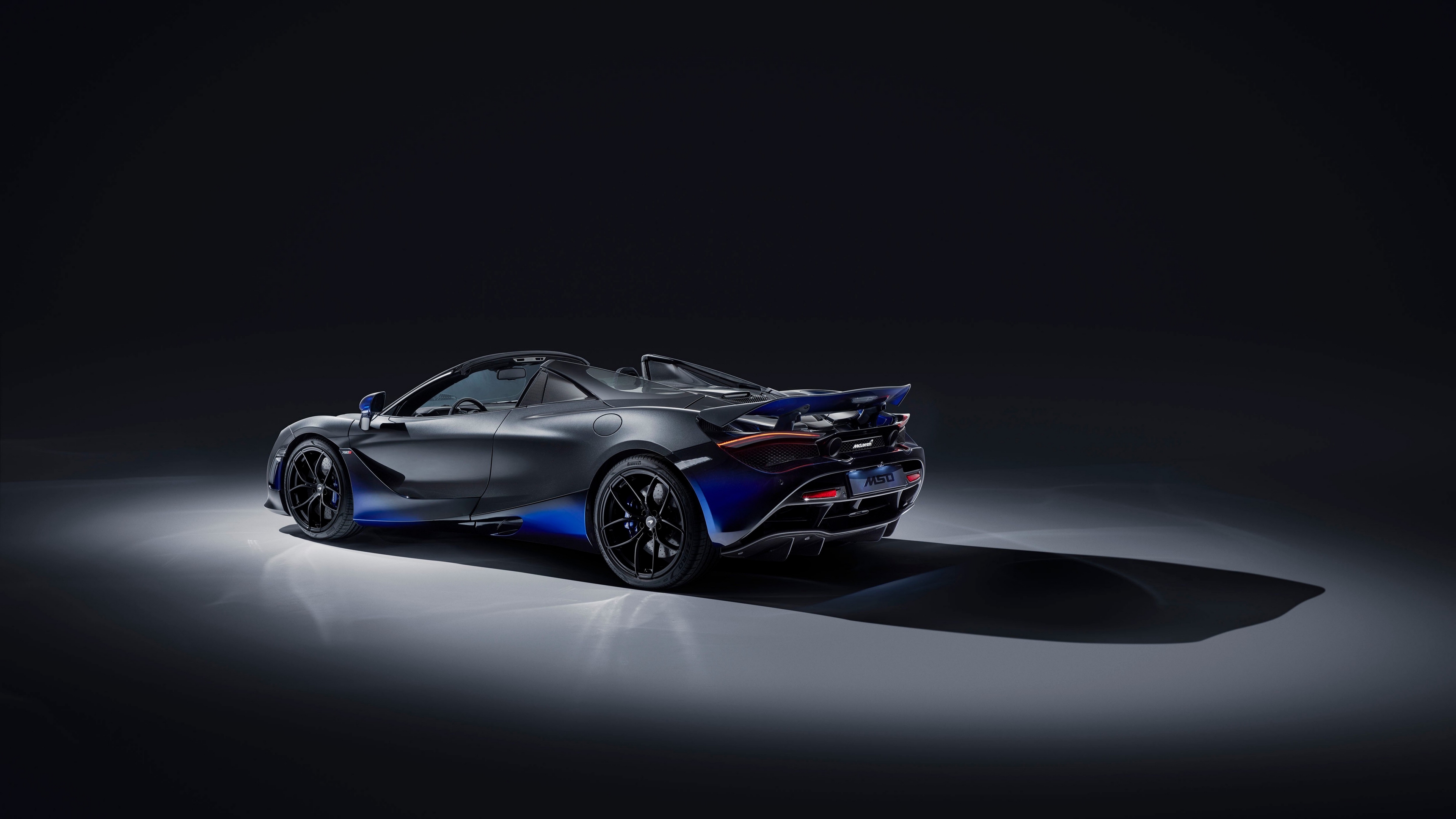 Description: A blue sports car is shown in the dark room with a spotlight on the floor and the top of the car.