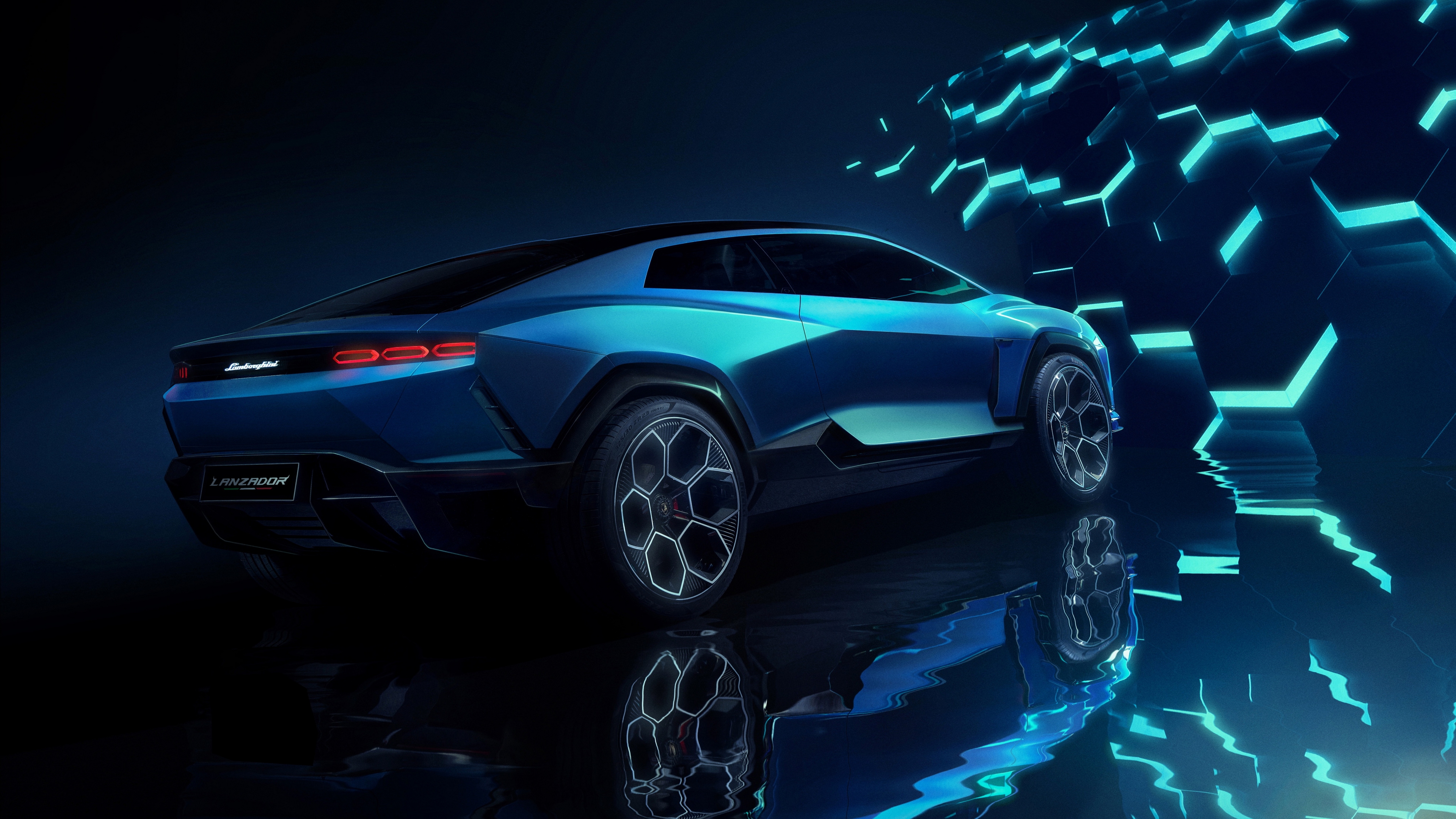 Description: A blue sports car is shown in a futuristic image with neon lights and a black background with a pattern of hexagon tiles.