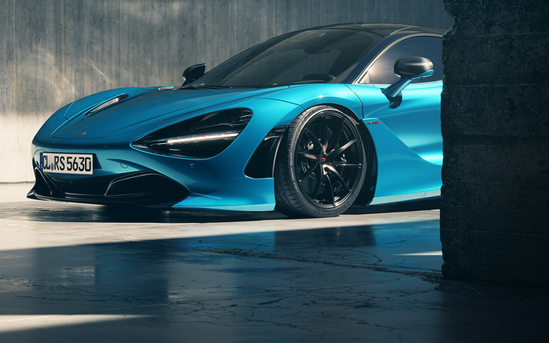 Description: A blue sports car parked in a garage next to a wall and a cement wall with a door open.