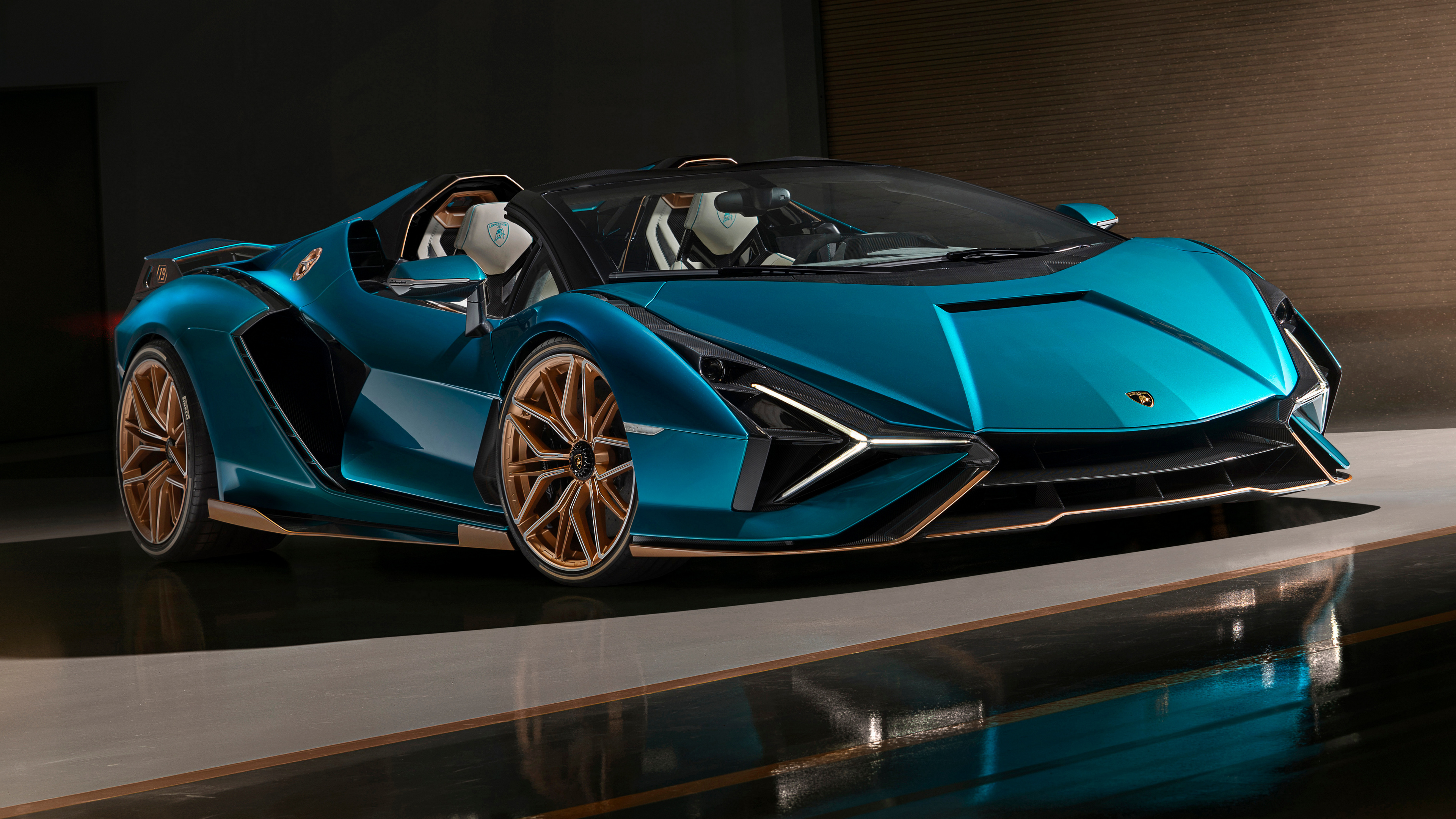 Description: A blue sports car is parked in a garage with its doors open and a man in the driver's seat.