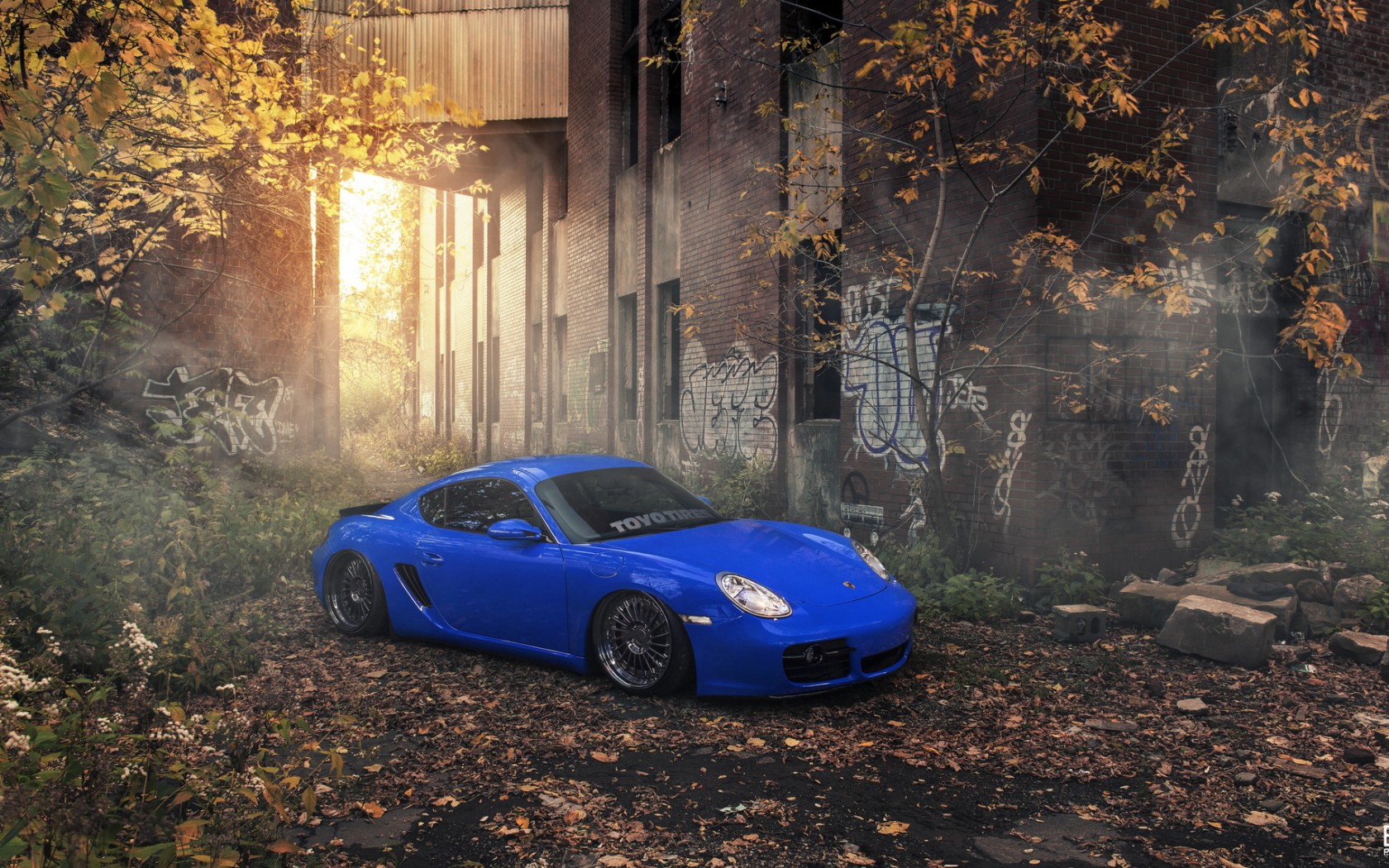 Description: A blue sports car parked in a leafy area next to a building with graffiti on it's walls.