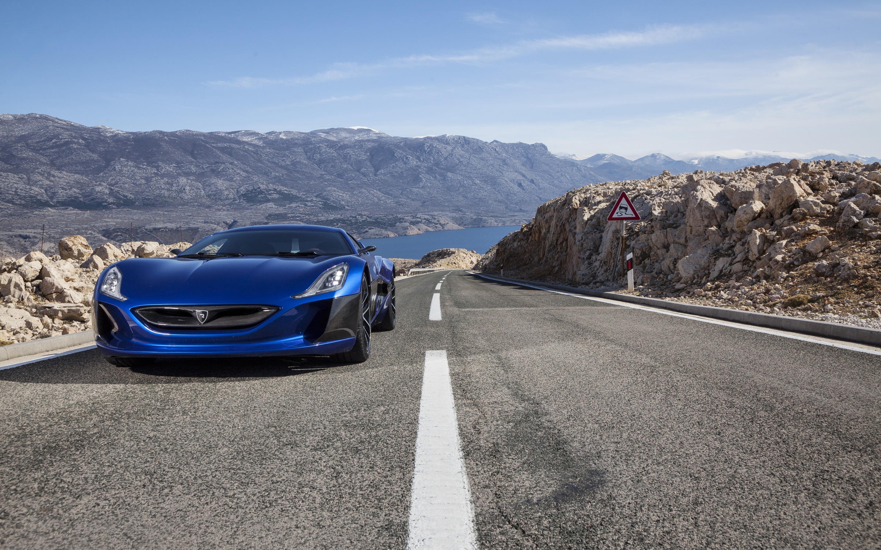 Description: A blue sports car driving down a mountain road next to a lake and mountains in the background with a sign warning of danger.