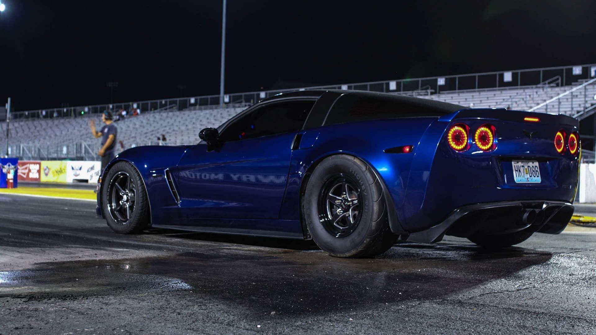 Description: A blue sports car driving down a race track at night time with a person standing on the side of the track.