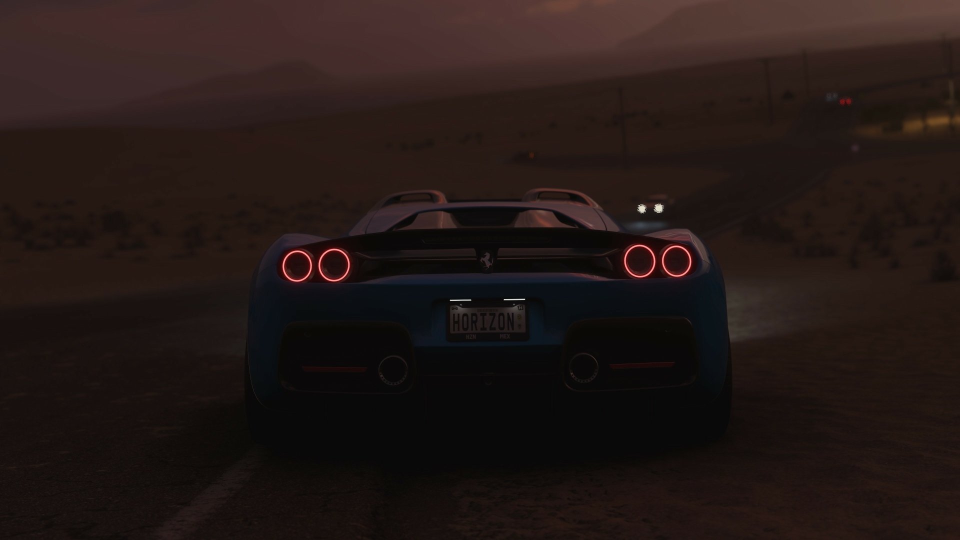 Description: A blue sports car driving down a road at night with its lights on and a red tail light on.