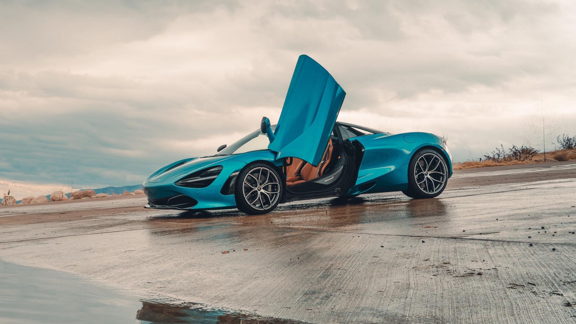 Description: A blue sports car with its doors open on a wet road with a sky background and clouds in the background.