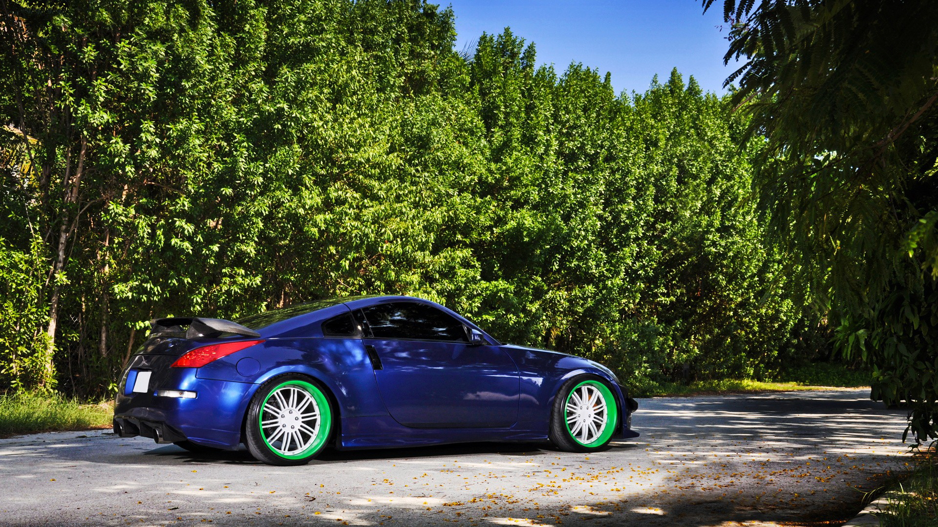Description: A blue sports car parked on a road in front of trees and bushes with green rims and a black top.