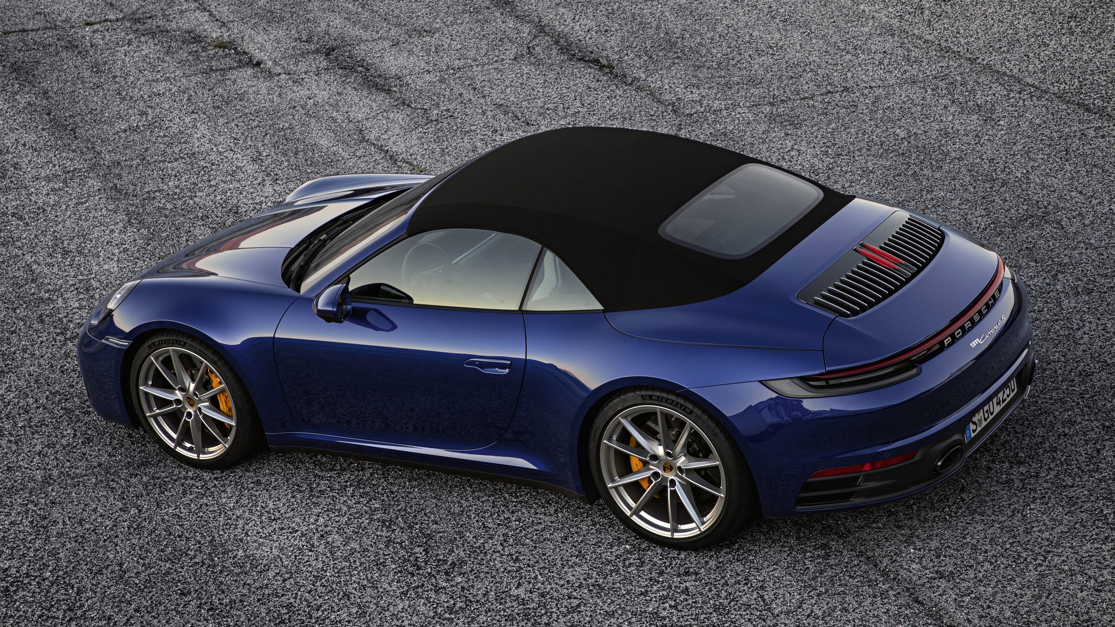 Description: A blue sports car driving on a race track with a black roof and black top on a sunny day.