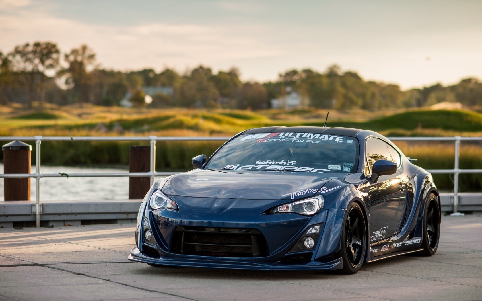 Description: A blue sports car parked on a road next to a fence and a body of water in the background.