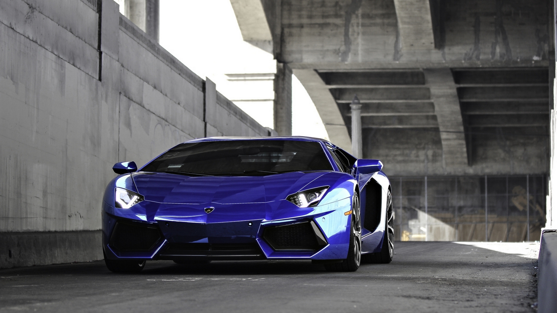 Description: A blue sports car parked in a tunnel under a bridge in a city with concrete walls and concrete floors.