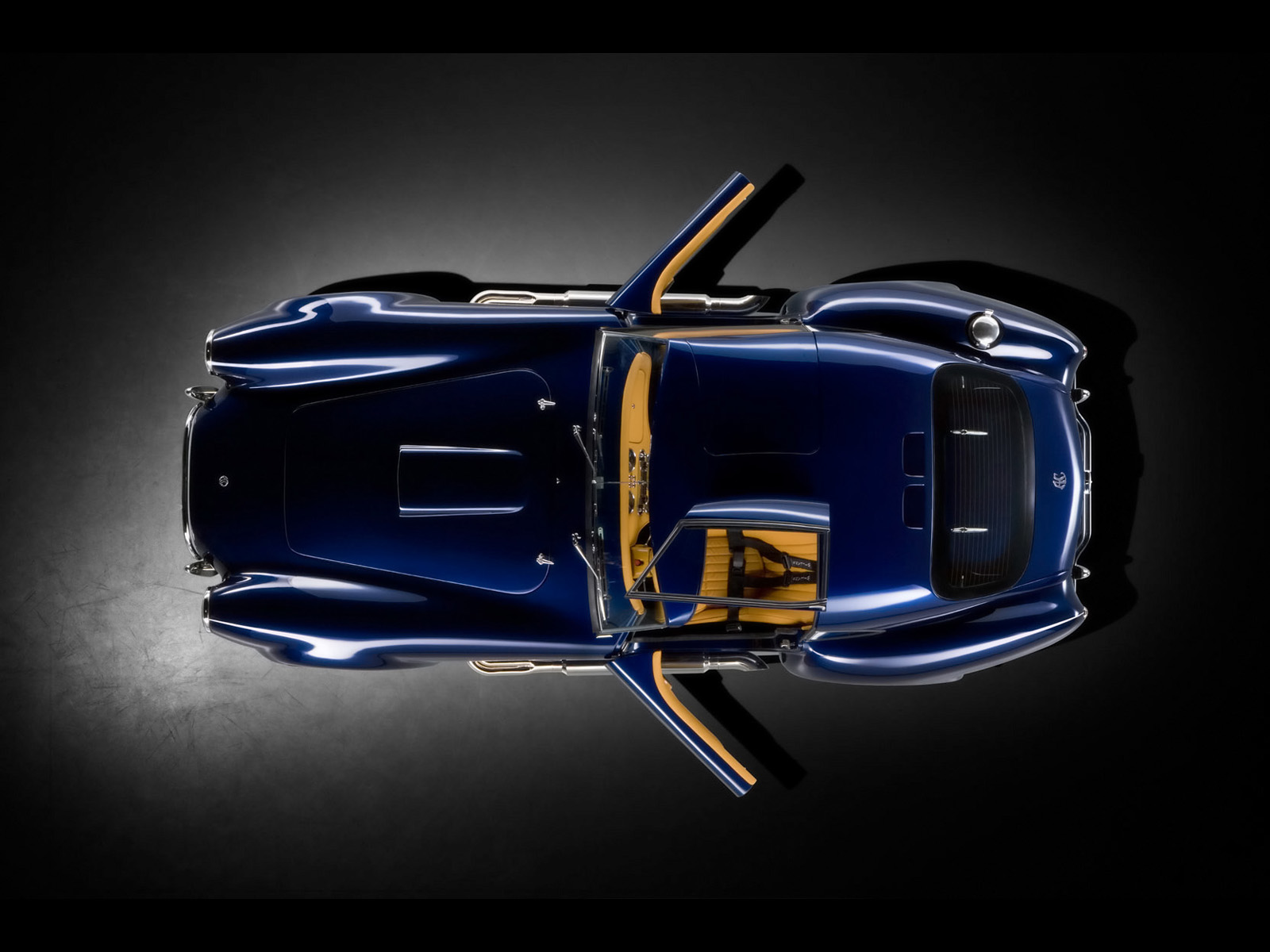 Description: A blue sports car with a yellow stripe on the hood and the hood up is shown from above.