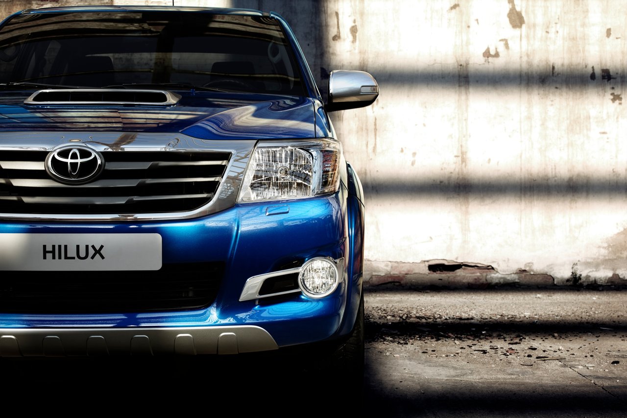 Description: A blue suv parked in front of a building with a sign on it's front window that says hilux.