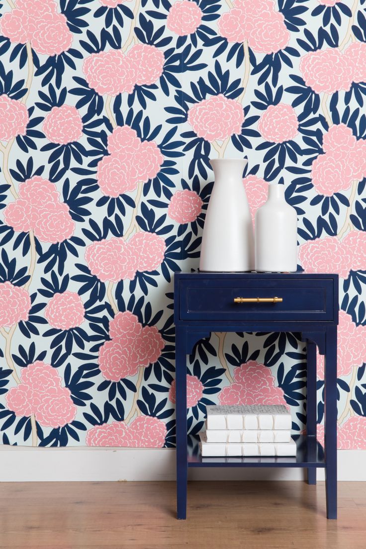 Description: A blue table with two vases on it next to a wall with a flower pattern on it and a blue table with a white vase on it.