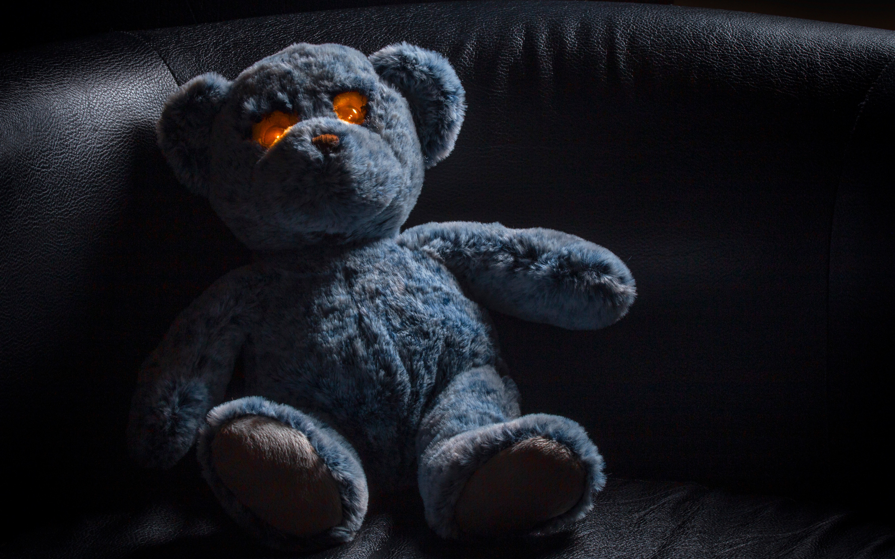 Description: A blue teddy bear sitting on a black chair with a glowing eyeball in its eyes and a black leather seat.