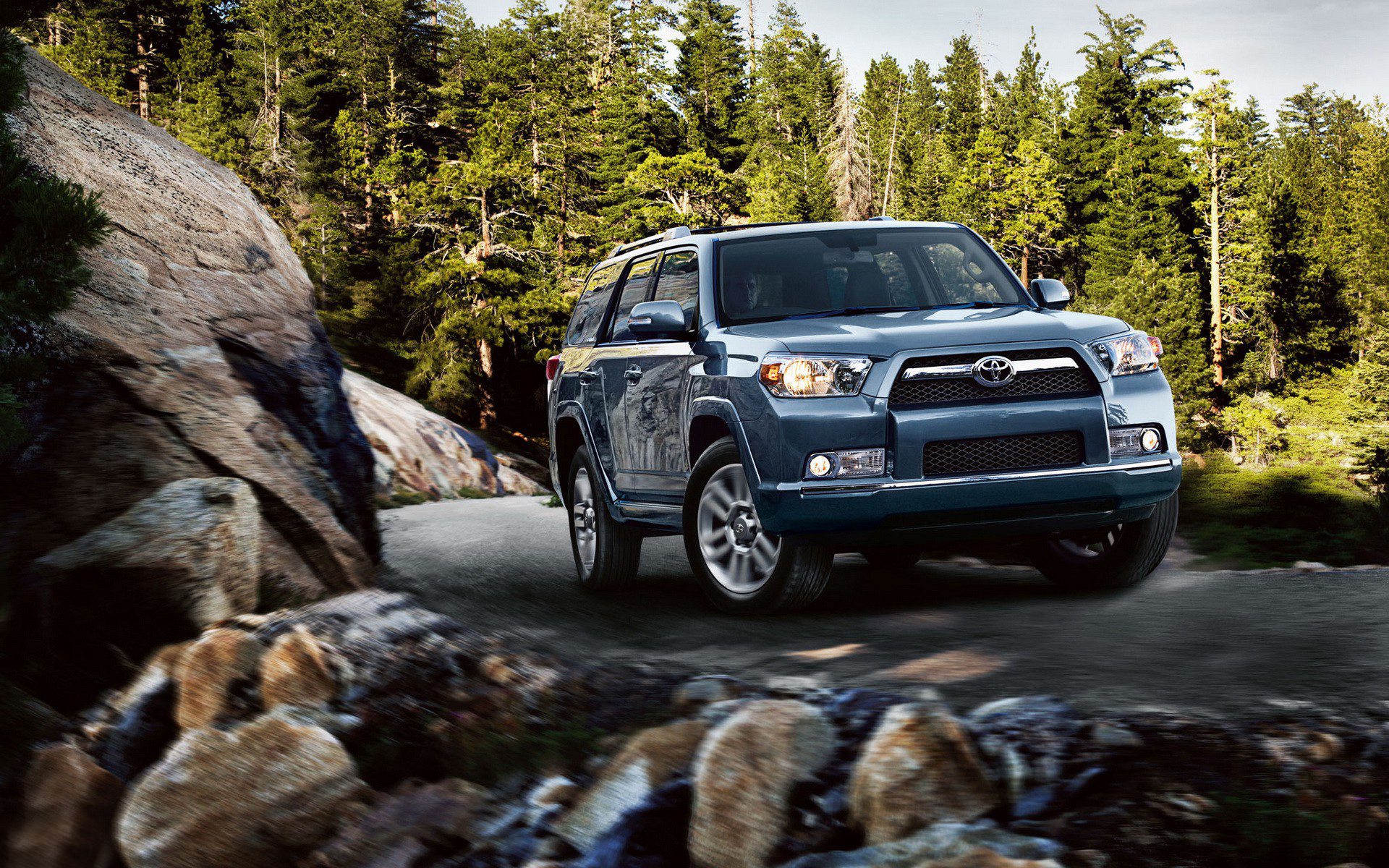 Description: A blue toyota 4runner driving down a road near a forest and rocks in the background with a rock outcropping.