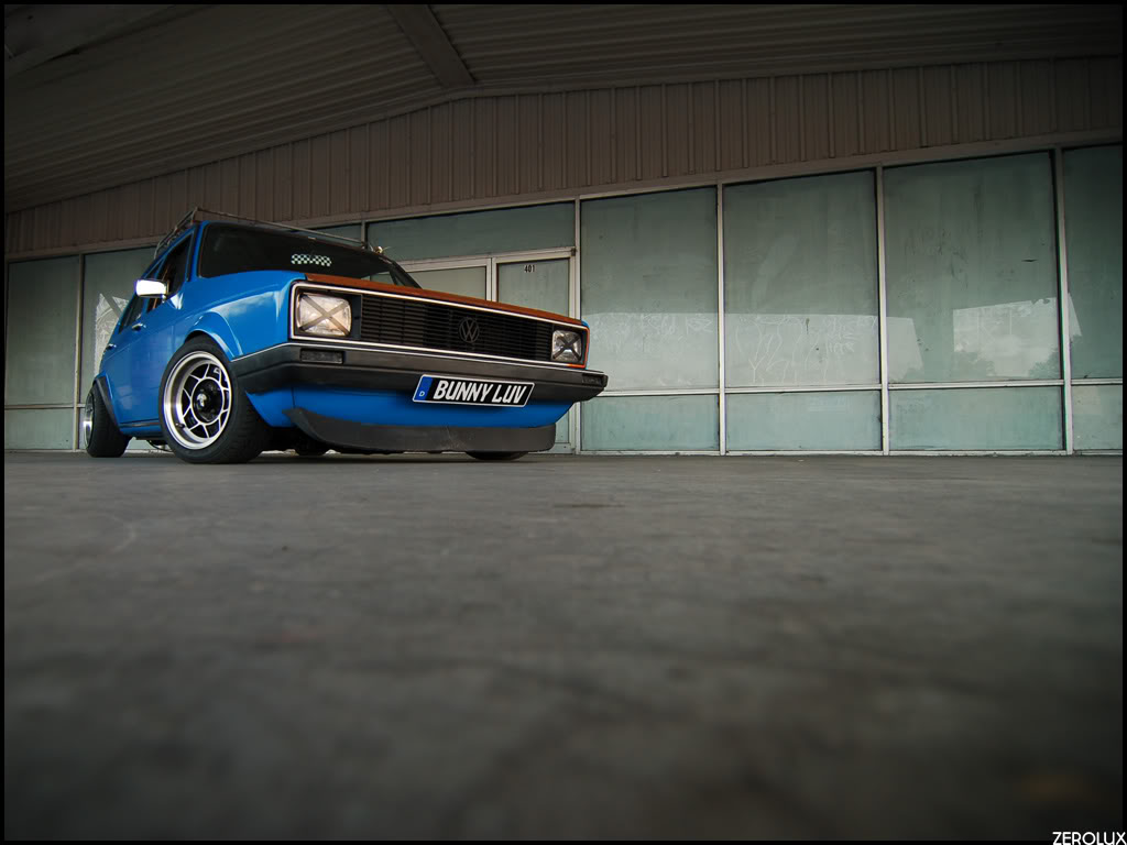Description: A blue truck parked in a garage next to a building with a window on the side of it and a door.