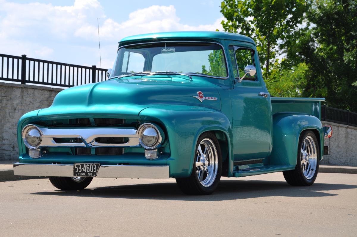 Description: A blue truck parked on the side of a road next to a fence and trees in the background with a sky background.