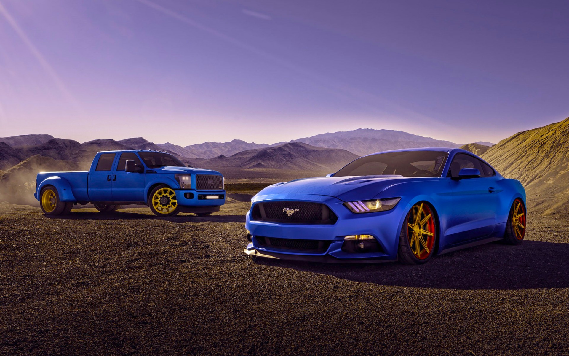 Description: Two blue trucks parked in a desert area with mountains in the background and a purple sky above them.