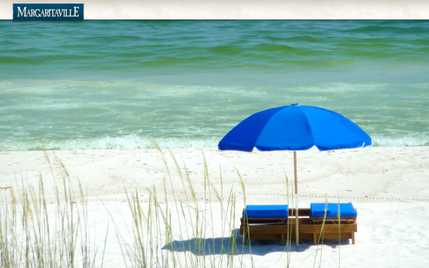 Description: A blue umbrella and two chairs on a beach near the ocean and sand dunes with grass and water in the background.