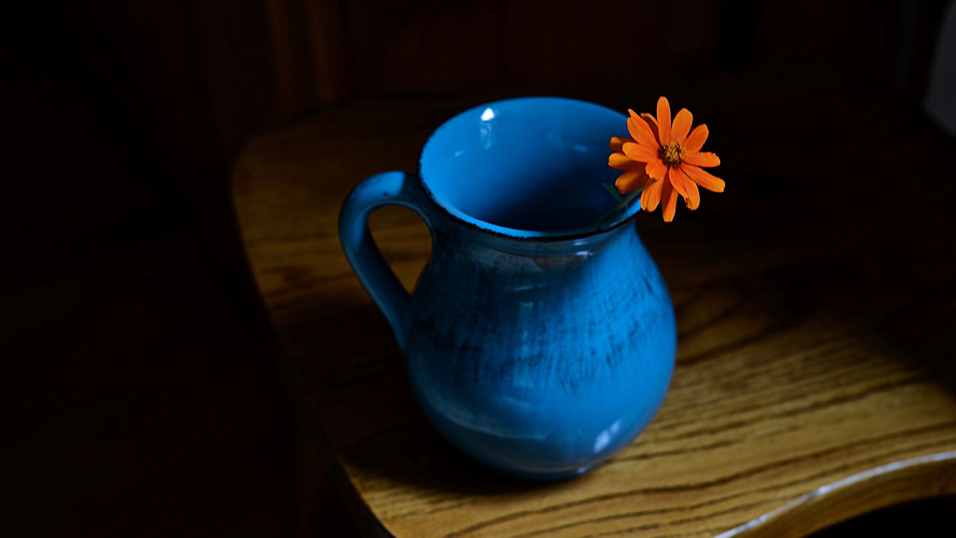Description: A blue vase with a flower in it on a table top with a wooden table top in the background.
