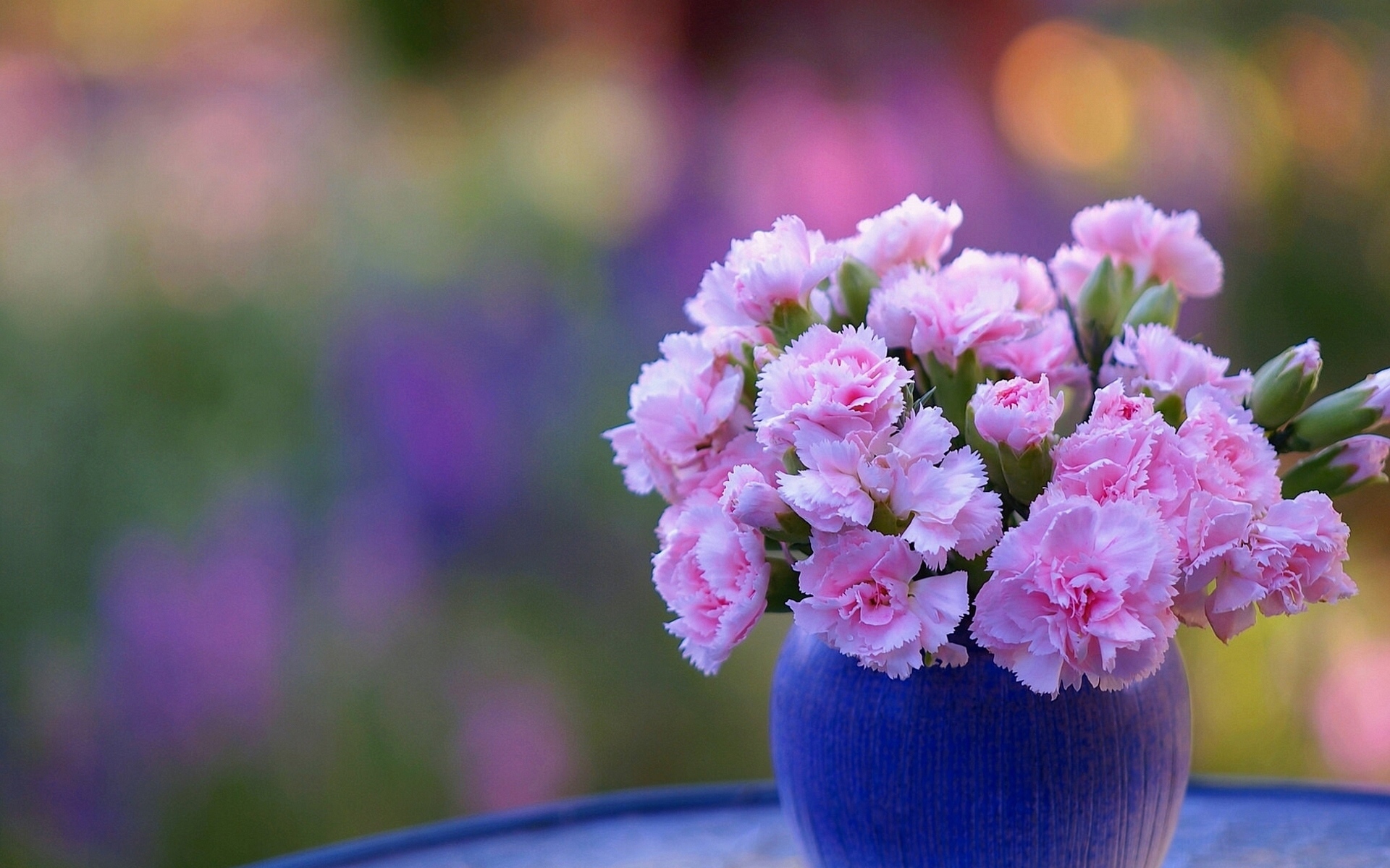 Description: A blue vase filled with pink flowers on top of a table in a garden of flowers in the background.