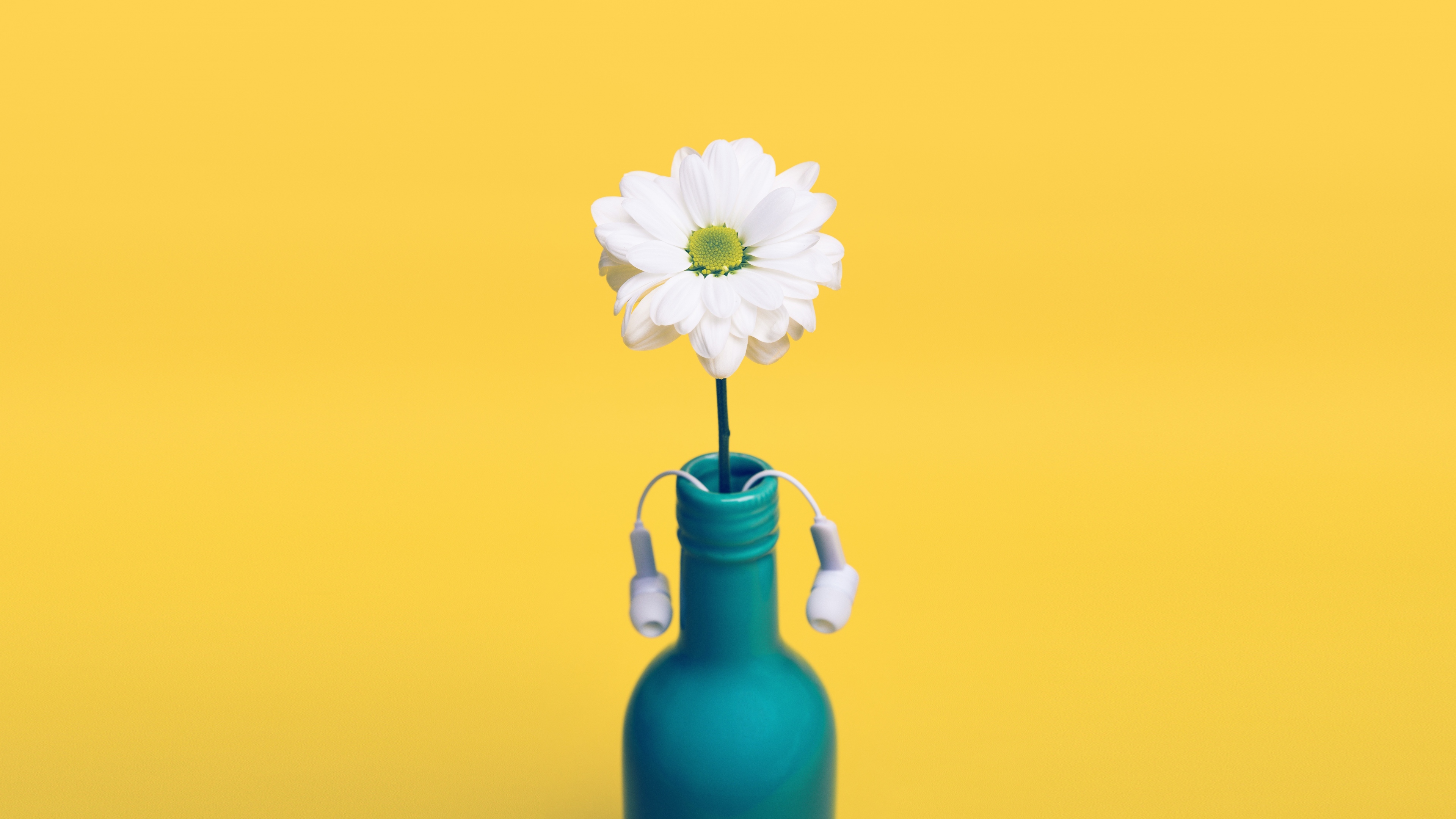 Description: A blue vase with a white flower in it on a yellow background with headphones in it and a yellow background.