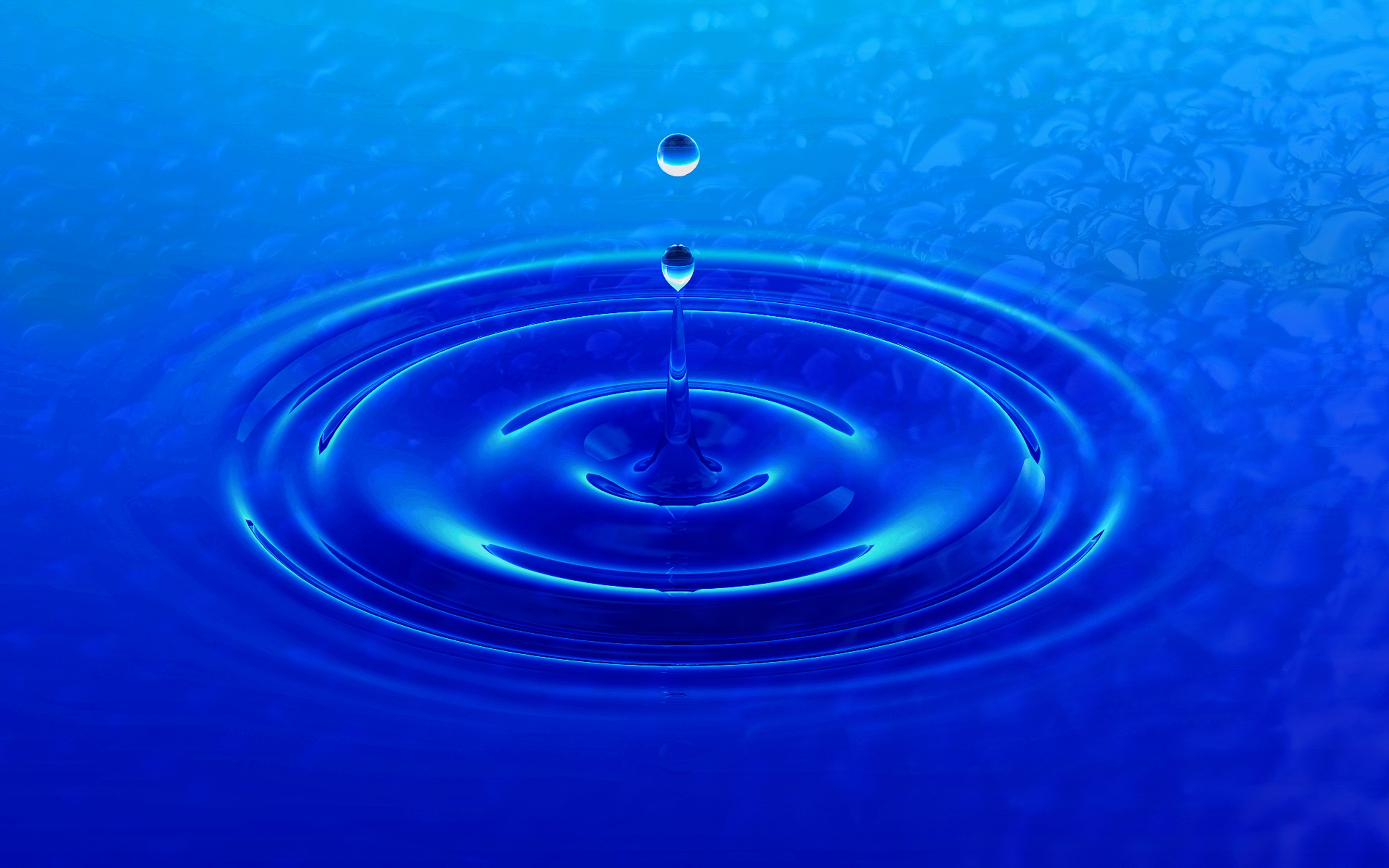 Description: A blue water droplet with a blue background and a blue sky background with a droplet of water.