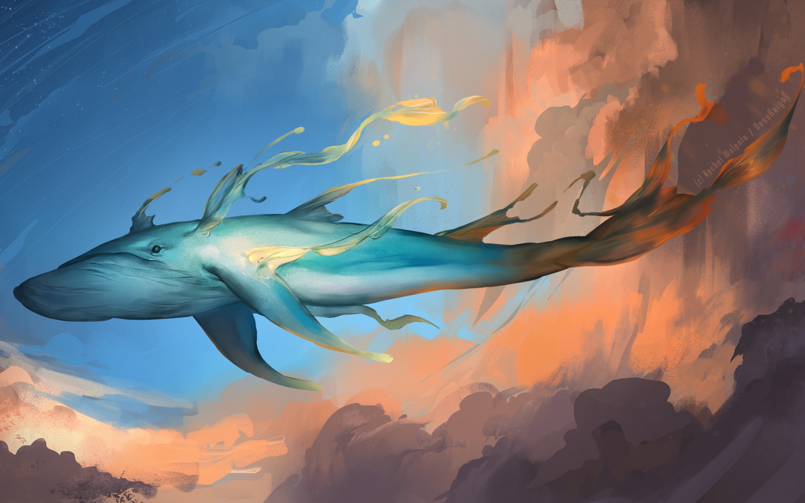 Description: A painting of a blue whale floating in the sky with a yellow tail and a yellow tail on its head.