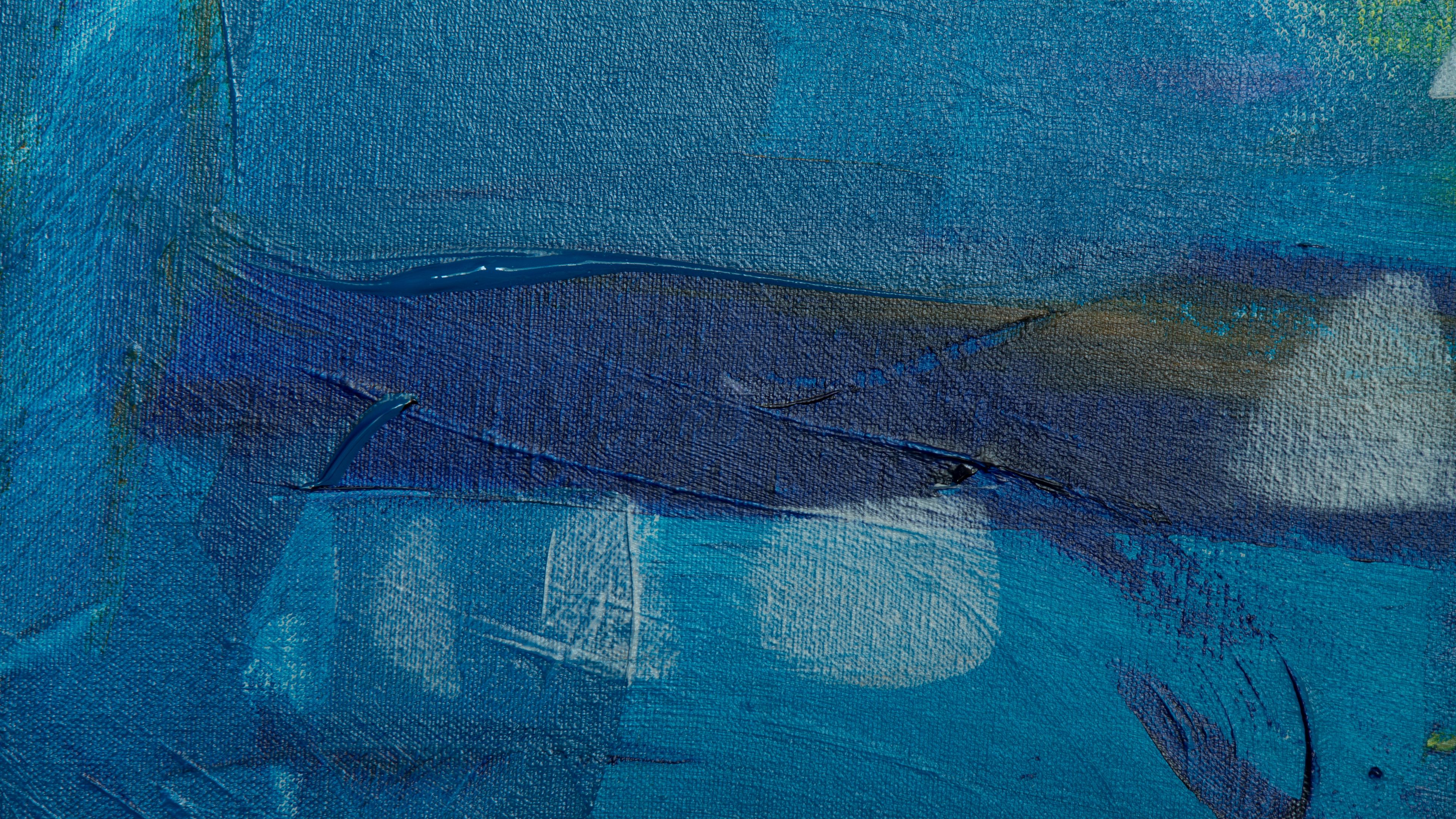 Description: A painting of a blue whale with a white boat in the background and a blue sky with clouds and a few white dots.
