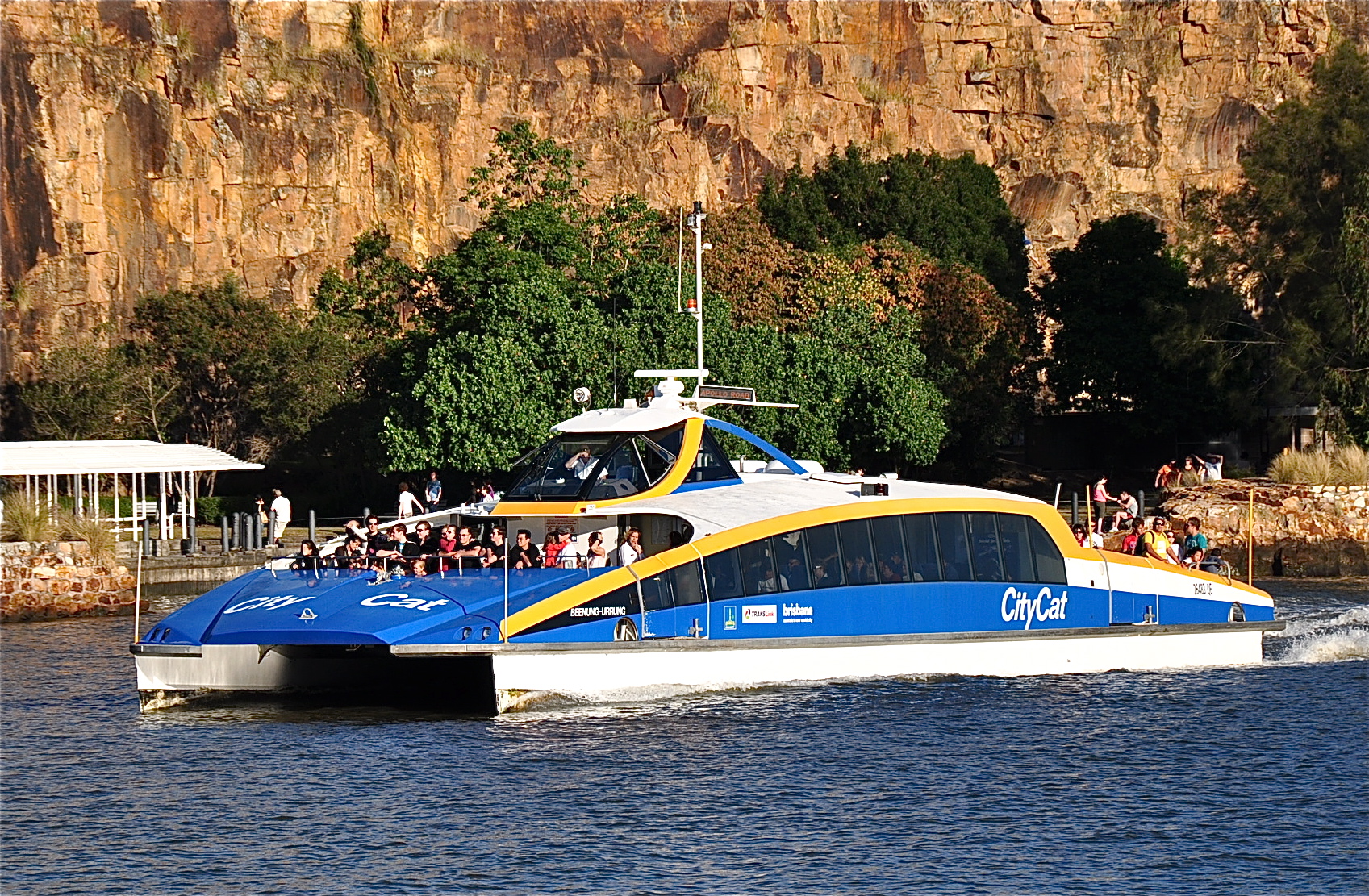 Description: A blue and white boat with people on it in the water near a mountain side area with trees and a cliff.