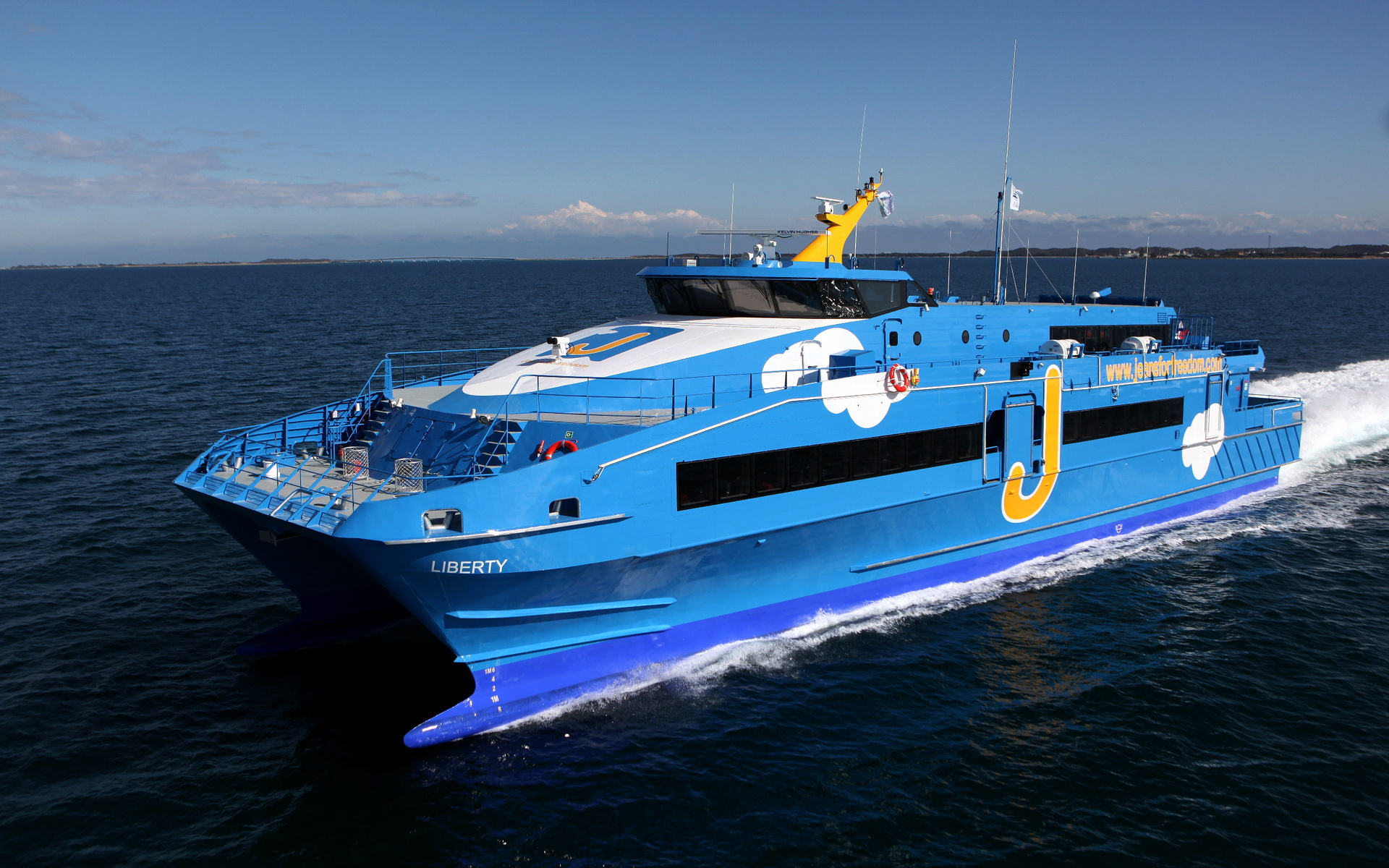 Description: A blue and white boat traveling on the water with a yellow and blue flag on it's side.
