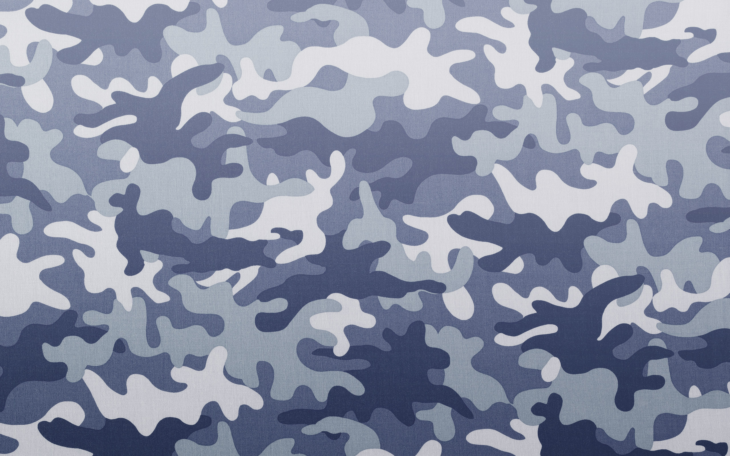 Description: A blue and white camouflage print background with a black border and a white border on the bottom of the image.