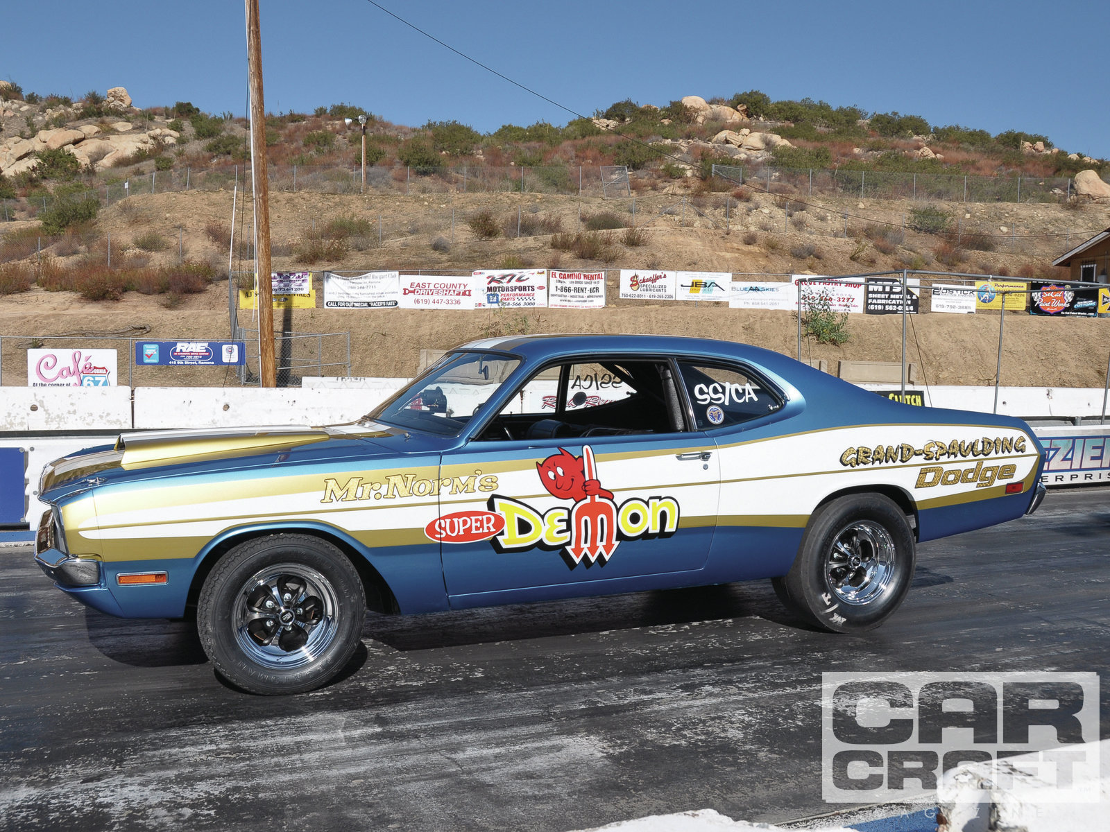 Description: A blue and white car with a cartoon character on the side of it's side door window and a sign that says don't.