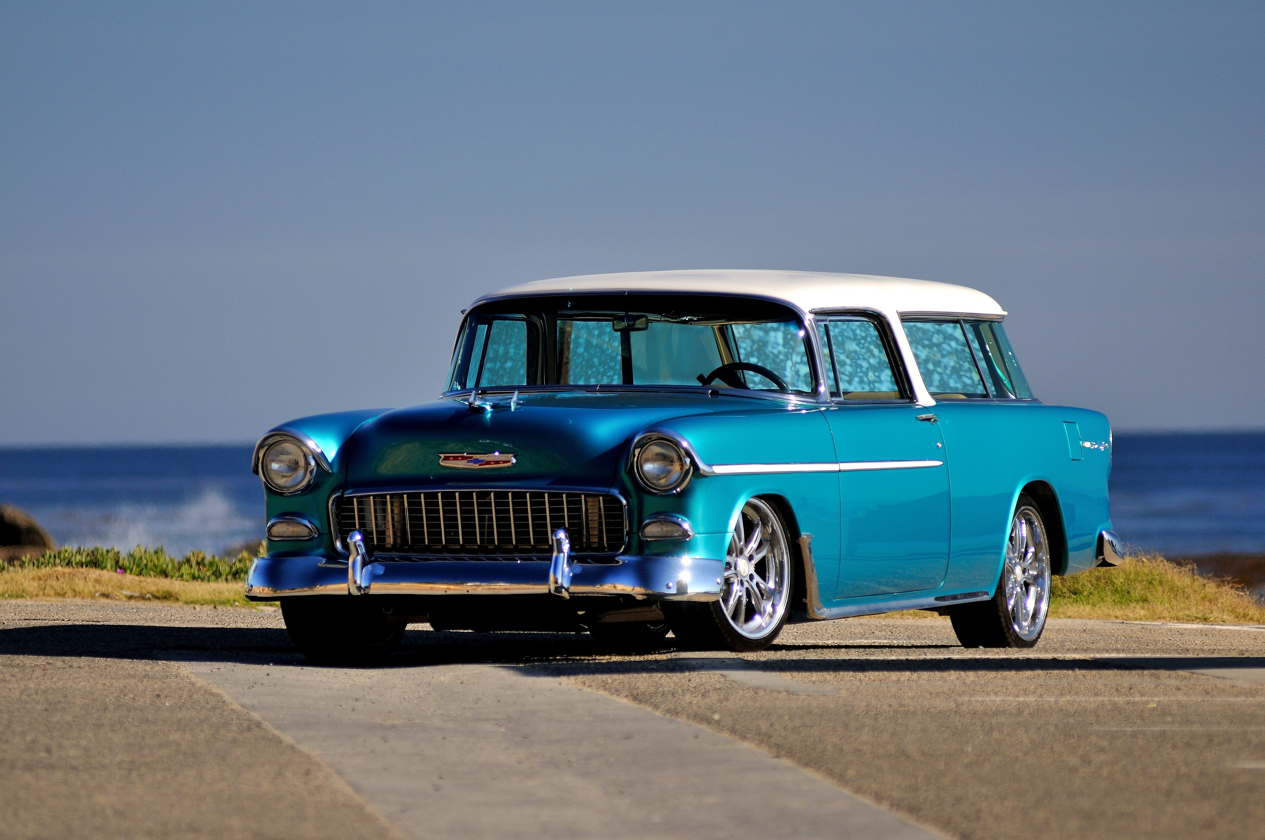 Description: A blue and white car parked on the side of the road near the ocean and grass on the shore.