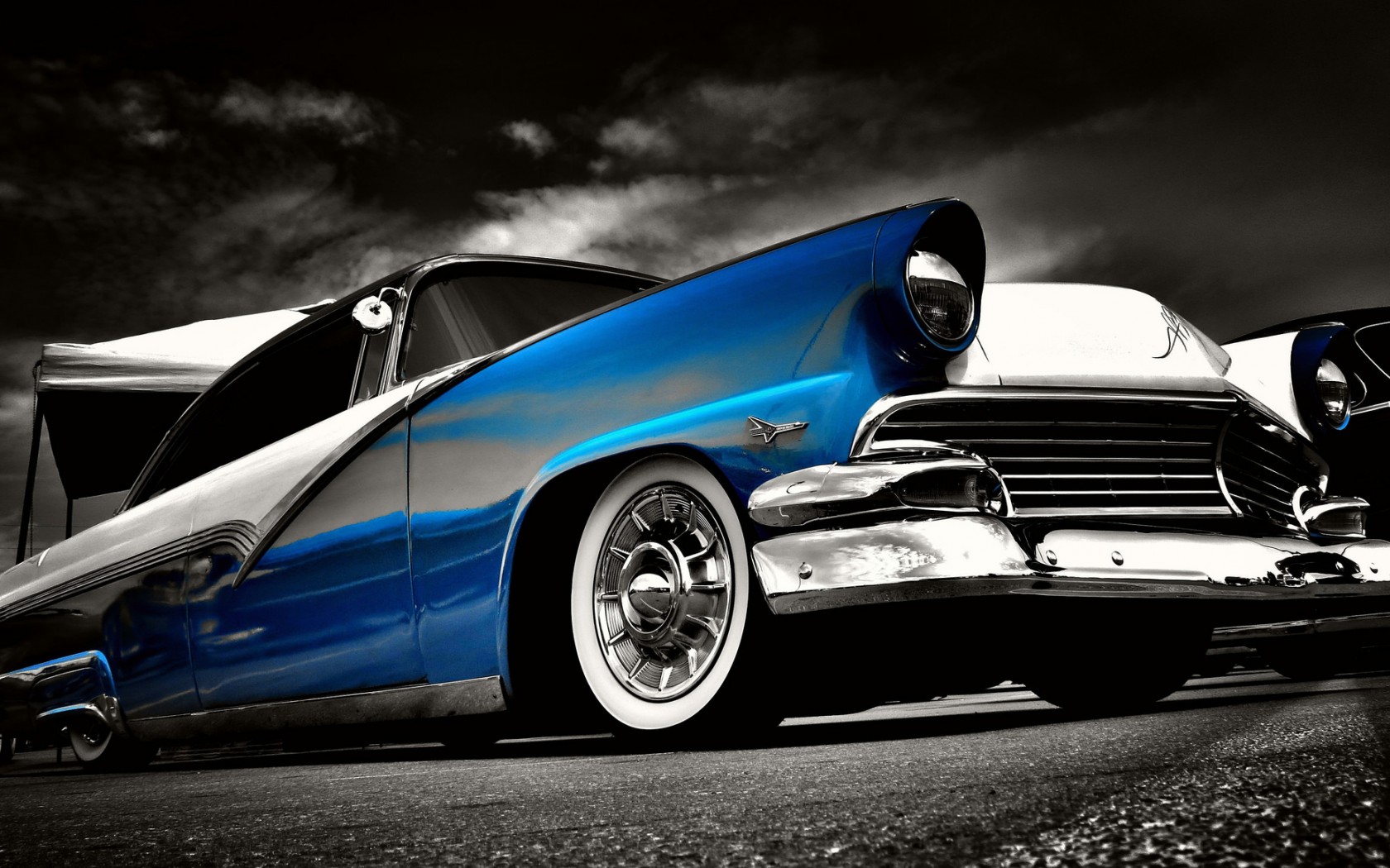 Description: A blue and white car parked on the side of a road next to a black car with a white top.