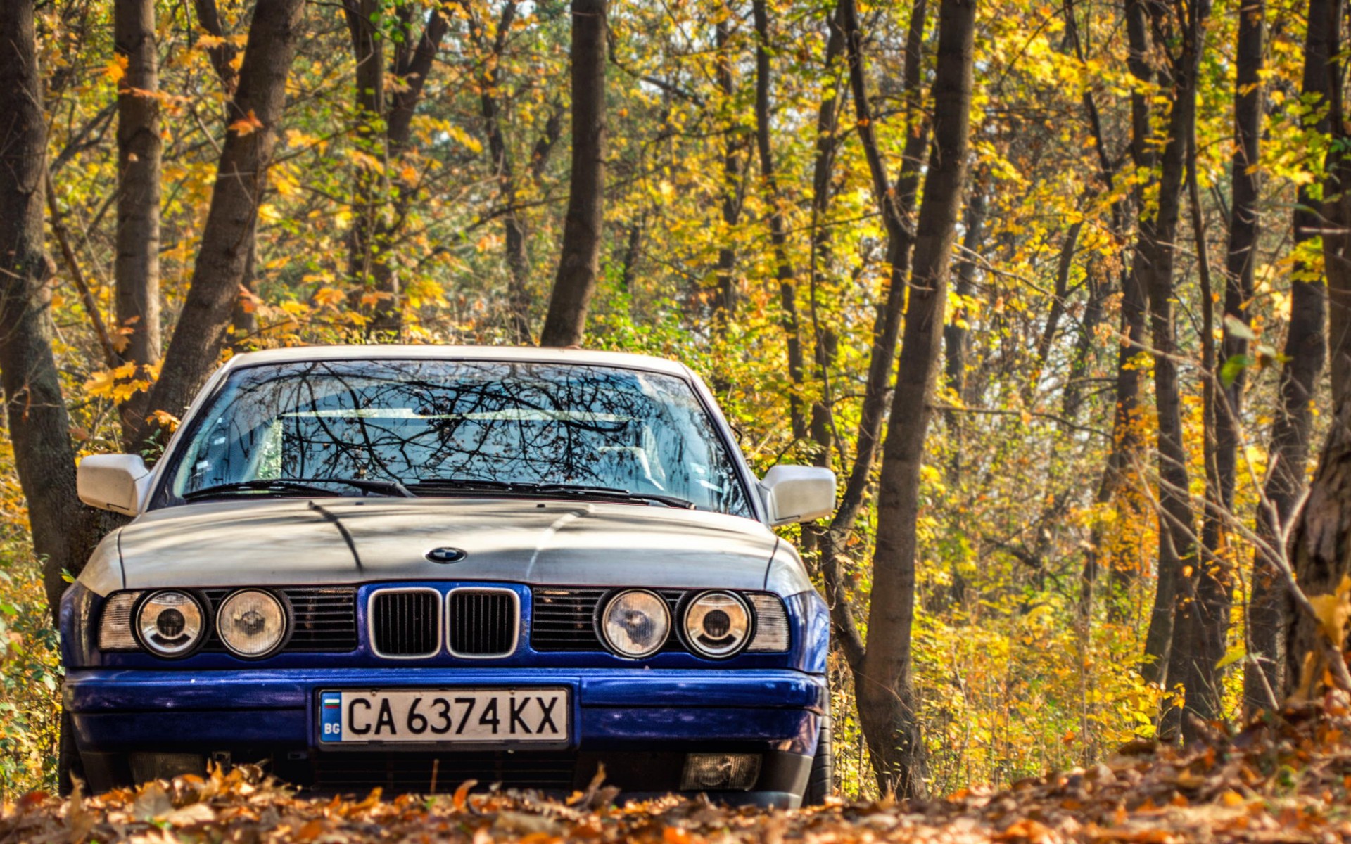 Description: A blue and white car parked in the woods near trees and leaves on the ground with a license plate.